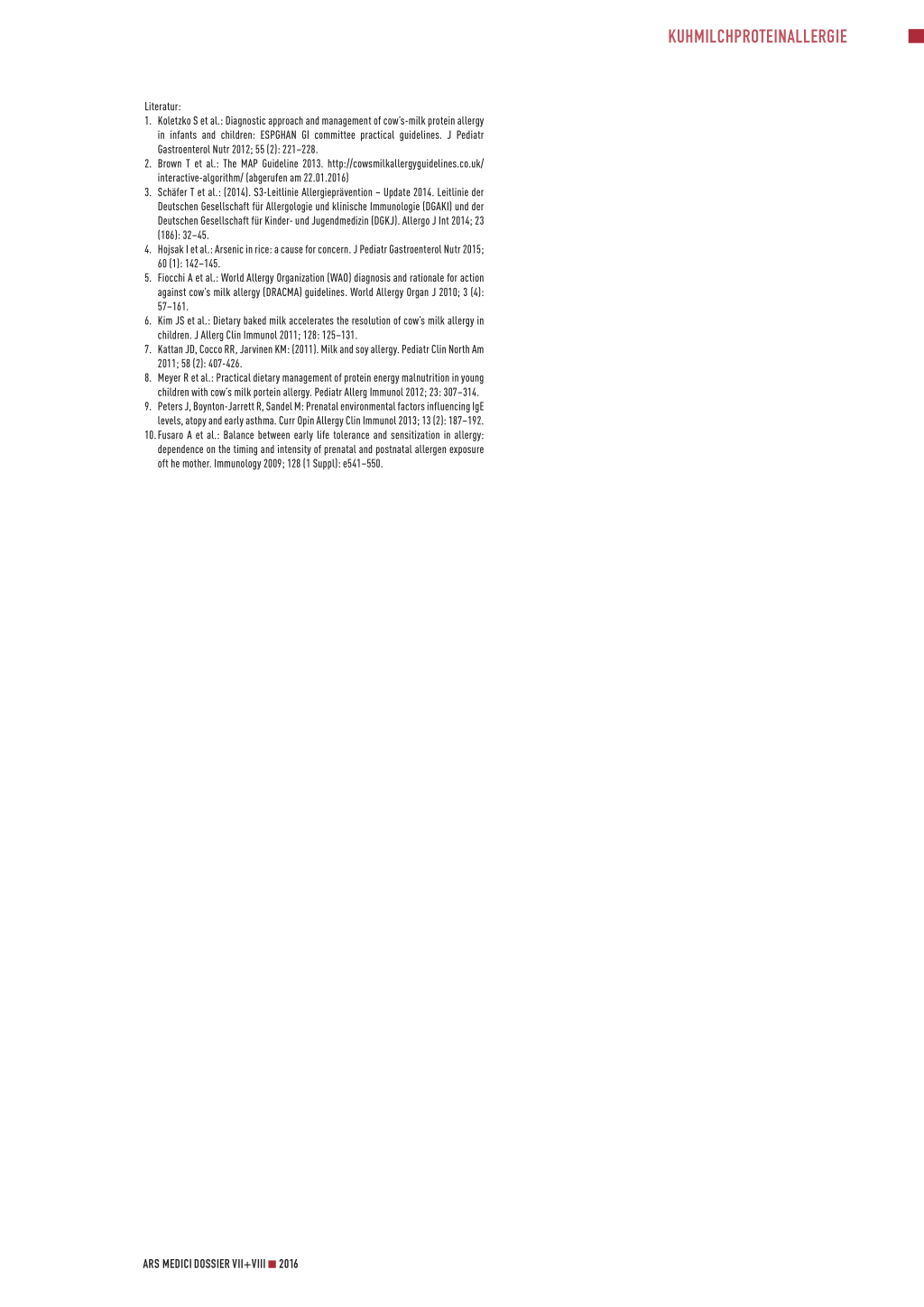 in infants and children: ESPGHAN GI committee practical guidelines. J Pediatr Gastroenterol Nutr 2012; 55 (2): 221–228. 2. Brown T et al.: The MAP Guideline 2013. http://cowsmilkallergyguidelines.co.uk/ interactive-algorithm/ (abgerufen am 22.01.2016) 3. Schäfer T et al.: (2014). S3-Leitlinie Allergieprävention – Update 2014. Leitlinie der Deutschen Gesellschaft für Allergologie und klinische Immunologie (DGAKI) und der Deutschen Gesellschaft für Kinder- und Jugendmedizin (DGKJ). Allergo J Int 2014; 23 (186): 32–45. 4. Hojsak I et al.: Arsenic in rice: a cause for concern. J Pediatr Gastroenterol Nutr 2015; 60 (1): 142–145. 5. Fiocchi A et al.: World Allergy Organization (WAO) diagnosis and rationale for action against cow’s milk allergy (DRACMA) guidelines. World Allergy Organ J 2010; 3 (4): 57–161. 6. Kim JS et al.: Dietary baked milk accelerates the resolution of cow’s milk allergy in children. J Allerg Clin Immunol 2011; 128: 125–131. 7. Kattan JD, Cocco RR, Jarvinen KM: (2011). Milk and soy allergy. Pediatr Clin North Am 2011; 58 (2): 407-426. 8. Meyer R et al.: Practical dietary management of protein energy malnutrition in young children with cow’s milk portein allergy. Pediatr Allerg Immunol 2012; 23: 307–314. 9. Peters J, Boynton-Jarrett R, Sandel M: Prenatal environmental factors influencing IgE levels, atopy and early asthma. Curr Opin Allergy Clin Immunol 2013; 13 (2): 187–192. 10. Fusaro A et al.: Balance between early life tolerance and sensitization in allergy: dependence on the timing and intensity of prenatal and postnatal allergen exposure oft he mother. Immunology 2009; 128 (1 Suppl): e541–550.