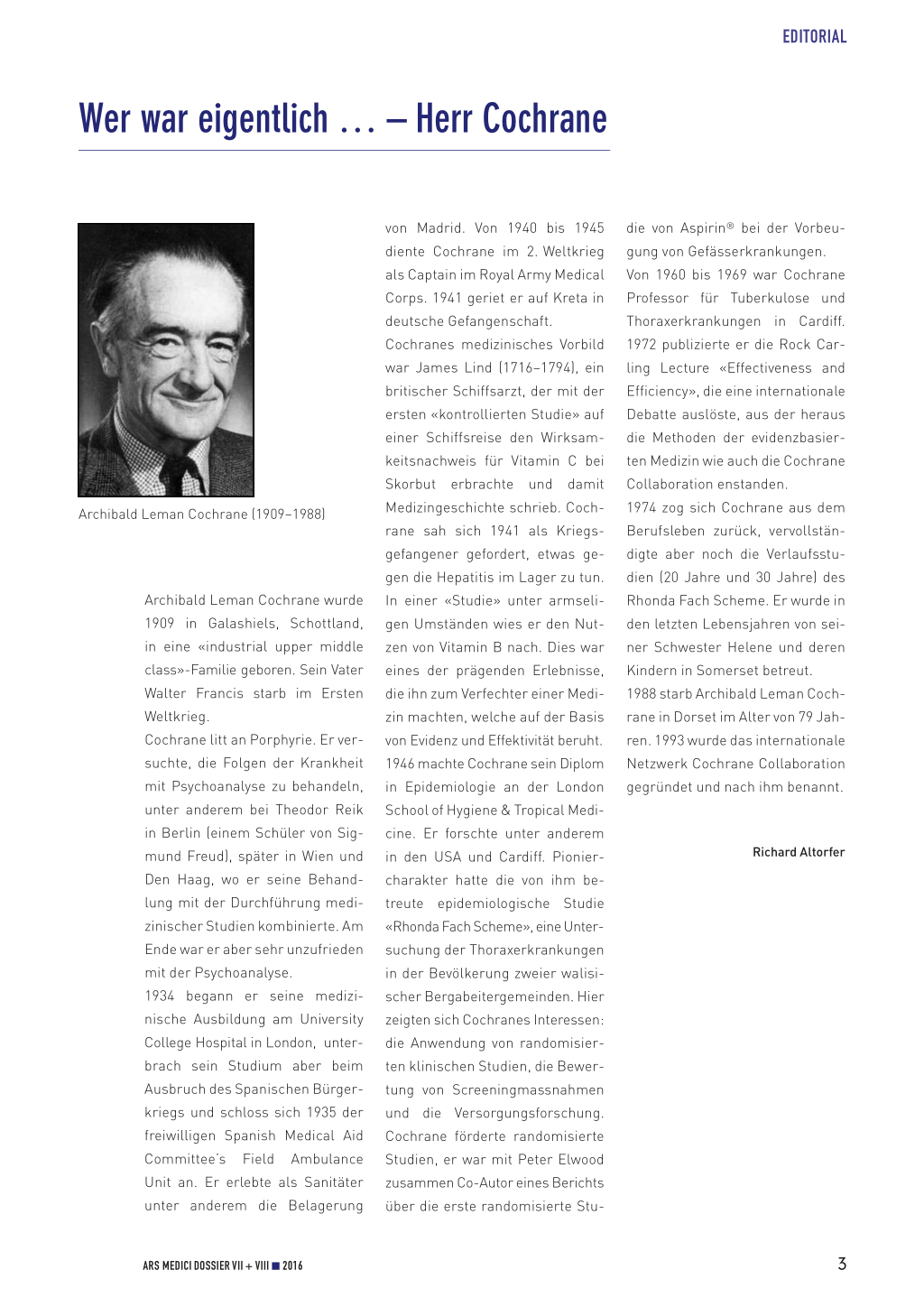 von Madrid. Von 1940 bis 1945 diente Cochrane im 2. Weltkrieg als Captain im Royal Army Medical Corps. 1941 geriet er auf Kreta in deutsche Gefangenschaft. Cochranes medizinisches Vorbild war James Lind (1716–1794), ein britischer Schiffsarzt, der mit der ersten «kontrollierten Studie» auf einer Schiffsreise den Wirksamkeitsnachweis für Vitamin C bei Skorbut erbrachte und damit Medizingeschichte schrieb. Cochrane sah sich 1941 als Kriegsgefangener gefordert, etwas gegen die Hepatitis im Lager zu tun. In einer «Studie» unter armseligen Umständen wies er den Nutzen von Vitamin B nach. Dies war eines der prägenden Erlebnisse, die ihn zum Verfechter einer Medizin machten, welche auf der Basis von Evidenz und Effektivität beruht. 1946 machte Cochrane sein Diplom in Epidemiologie an der London School of Hygiene & Tropical Medicine. Er forschte unter anderem in den USA und Cardiff. Pioniercharakter hatte die von ihm betreute epidemiologische Studie «Rhonda Fach Scheme», eine Untersuchung der Thoraxerkrankungen in der Bevölkerung zweier walisischer Bergabeitergemeinden. Hier zeigten sich Cochranes Interessen: die Anwendung von randomisierten klinischen Studien, die Bewertung von Screeningmassnahmen und die Versorgungsforschung. Cochrane förderte randomisierte Studien, er war mit Peter Elwood zusammen Co-Autor eines Berichts über die erste randomisierte Stu-