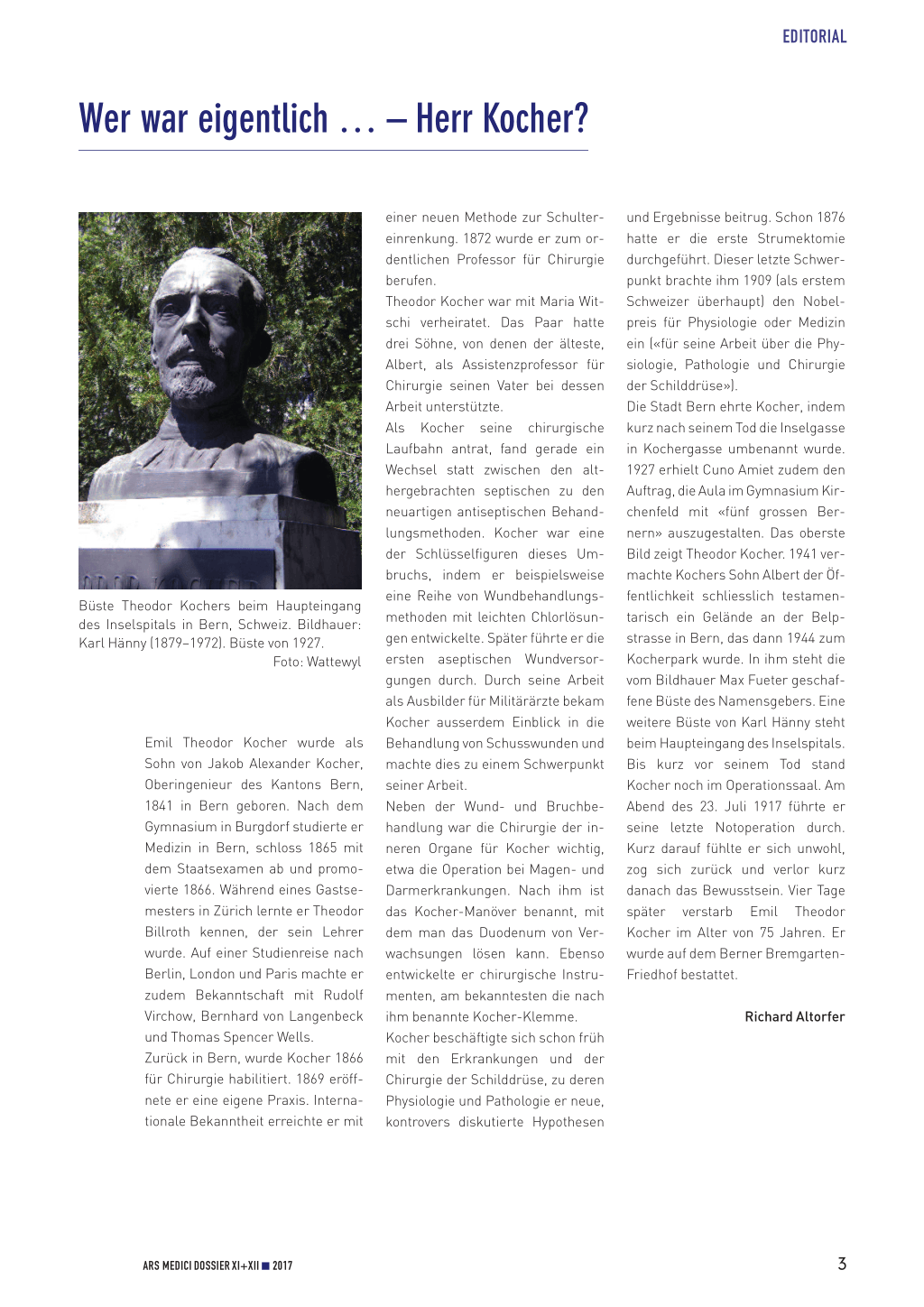 und Ergebnisse beitrug. Schon 1876 hatte er die erste Strumektomie durchgeführt. Dieser letzte Schwerpunkt brachte ihm 1909 (als erstem Schweizer überhaupt) den Nobelpreis für Physiologie oder Medizin ein («für seine Arbeit über die Physiologie, Pathologie und Chirurgie der Schilddrüse»). Die Stadt Bern ehrte Kocher, indem kurz nach seinem Tod die Inselgasse in Kochergasse umbenannt wurde. 1927 erhielt Cuno Amiet zudem den Auftrag, die Aula im Gymnasium Kirchenfeld mit «fünf grossen Bernern» auszugestalten. Das oberste Bild zeigt Theodor Kocher. 1941 vermachte Kochers Sohn Albert der Öffentlichkeit schliesslich testamentarisch ein Gelände an der Belpstrasse in Bern, das dann 1944 zum Kocherpark wurde. In ihm steht die vom Bildhauer Max Fueter geschaffene Büste des Namensgebers. Eine weitere Büste von Karl Hänny steht beim Haupteingang des Inselspitals. Bis kurz vor seinem Tod stand Kocher noch im Operationssaal. Am Abend des 23. Juli 1917 führte er seine letzte Notoperation durch. Kurz darauf fühlte er sich unwohl, zog sich zurück und verlor kurz danach das Bewusstsein. Vier Tage später verstarb Emil Theodor Kocher im Alter von 75 Jahren. Er wurde auf dem Berner BremgartenFriedhof bestattet.