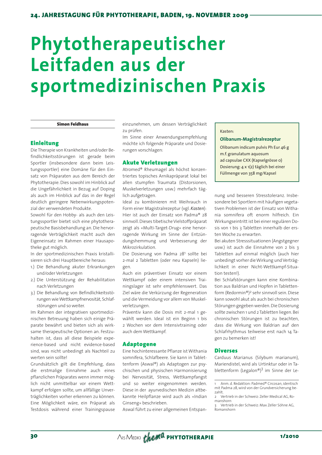 rungen wie Wettkampfnervosität, Schlafstörungen und so weiter. Im Rahmen der integrativen sportmedizinischen Betreuung haben sich einige Präparate bewährt und bieten sich als wirksame therapeutische Optionen an. Festzuhalten ist, dass all diese Beispiele experience-based und nicht evidence-based sind, was nicht unbedingt als Nachteil zu werten sein sollte! Grundsätzlich gilt die Empfehlung, dass die erstmalige Einnahme auch eines pflanzlichen Präparates wenn immer möglich nicht unmittelbar vor einem Wettkampf erfolgen sollte, um allfällige Unverträglichkeiten vorher erkennen zu können. Eine Möglichkeit wäre, ein Präparat als Testdosis während einer Trainingspause