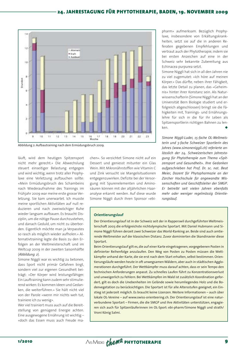 wieder langsam aufbauen. Es braucht Disziplin, um die nötige Pause durchzustehen, und danach Geduld, um nicht zu überborden. Eigentlich möchte man ja Verpasstes so rasch als möglich wieder aufholen.» Alternativtraining legte die Basis zu den Erfolgen an der Weltmeisterschaft und im Weltcup 2009 in der zweiten Saisonhälfte (Abbildung 2). Simone Niggli war es wichtig zu betonen, dass Sport nicht primär Gefahren birgt, sondern viel zur eigenen Gesundheit beiträgt: «Der Körper wird leistungsfähiger. Ein Lauftraining kann zudem sehr stimulierend wirken: Es kommen Ideen und Gedanken, die weiterführen.» Sie hält nicht viel von der Parole «wenn mir nichts weh tut, trainiere ich zu wenig». Wer viel trainiert muss auch auf die Bereitstellung von genügend Energie achten. Eine ausgewogene Ernährung ist wichtig –