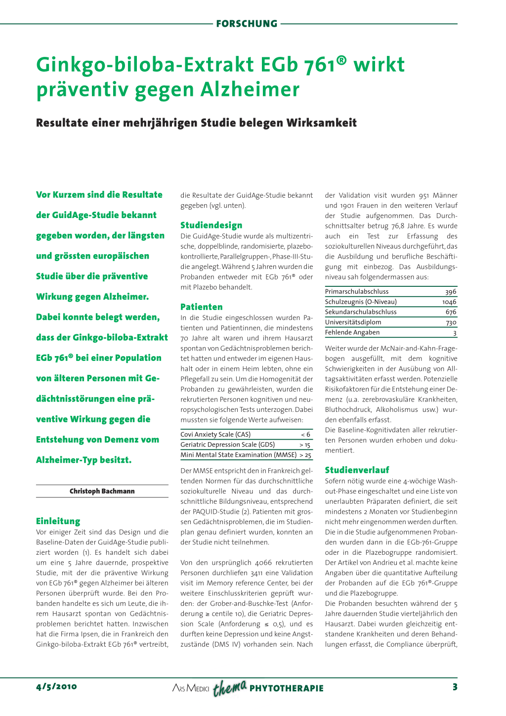 Die GuidAge-Studie wurde als multizentrische, doppelblinde, randomisierte, plazebokontrollierte, Parallelgruppen-, Phase-III-Studie angelegt.Während 5 Jahren wurden die Probanden entweder mit EGb 761® oder mit Plazebo behandelt.