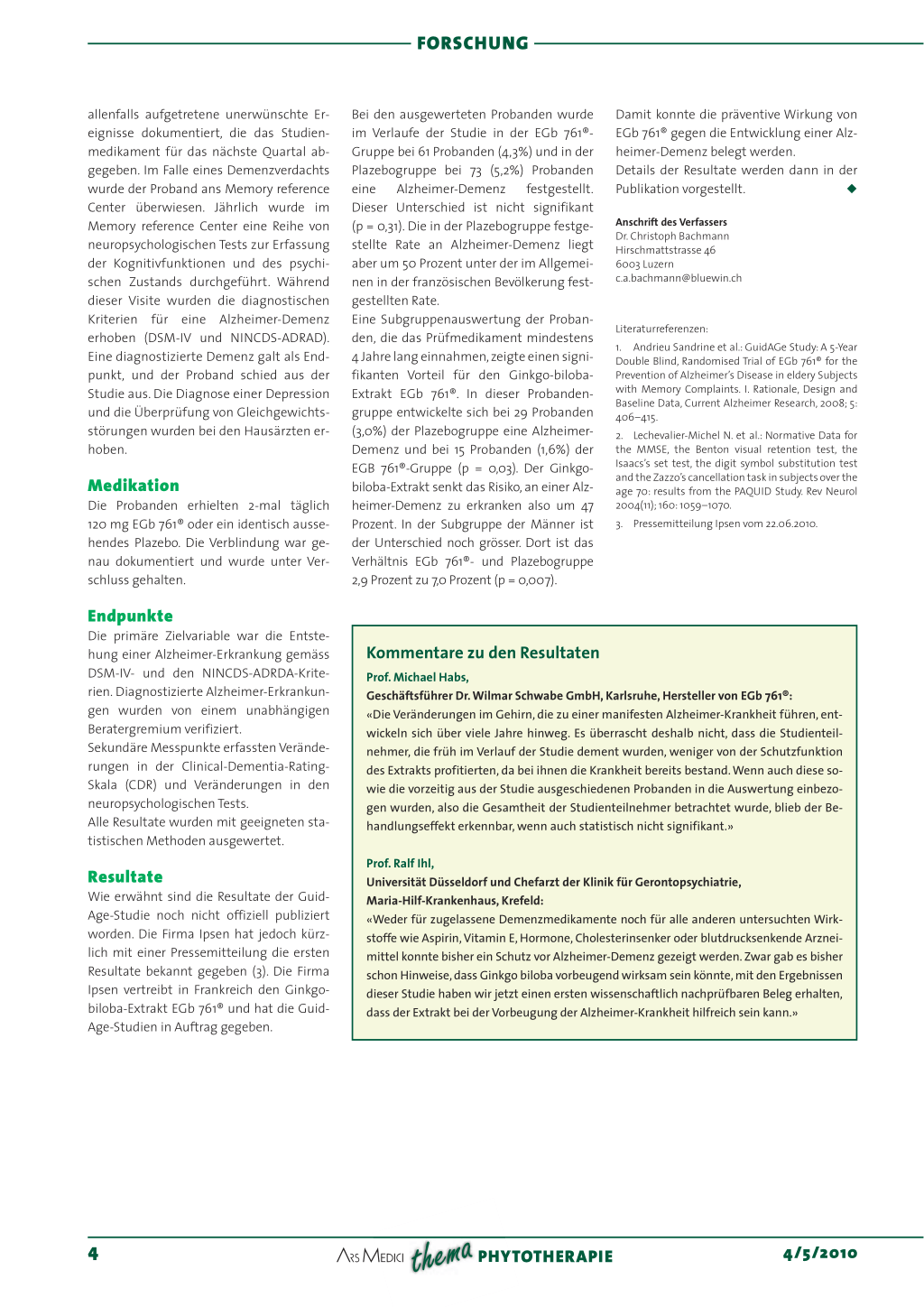 Wie erwähnt sind die Resultate der GuidAge-Studie noch nicht offiziell publiziert worden. Die Firma Ipsen hat jedoch kürzlich mit einer Pressemitteilung die ersten Resultate bekannt gegeben (3). Die Firma Ipsen vertreibt in Frankreich den Ginkgobiloba-Extrakt EGb 761® und hat die GuidAge-Studien in Auftrag gegeben.