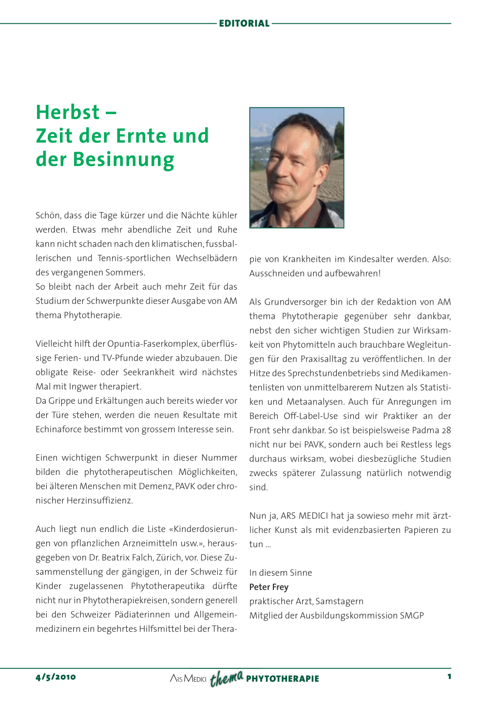 Schön, dass die Tage kürzer und die Nächte kühler werden. Etwas mehr abendliche Zeit und Ruhe kann nicht schaden nach den klimatischen, fussballerischen und Tennis-sportlichen Wechselbädern des vergangenen Sommers. So bleibt nach der Arbeit auch mehr Zeit für das Studium der Schwerpunkte dieser Ausgabe von AM thema Phytotherapie.