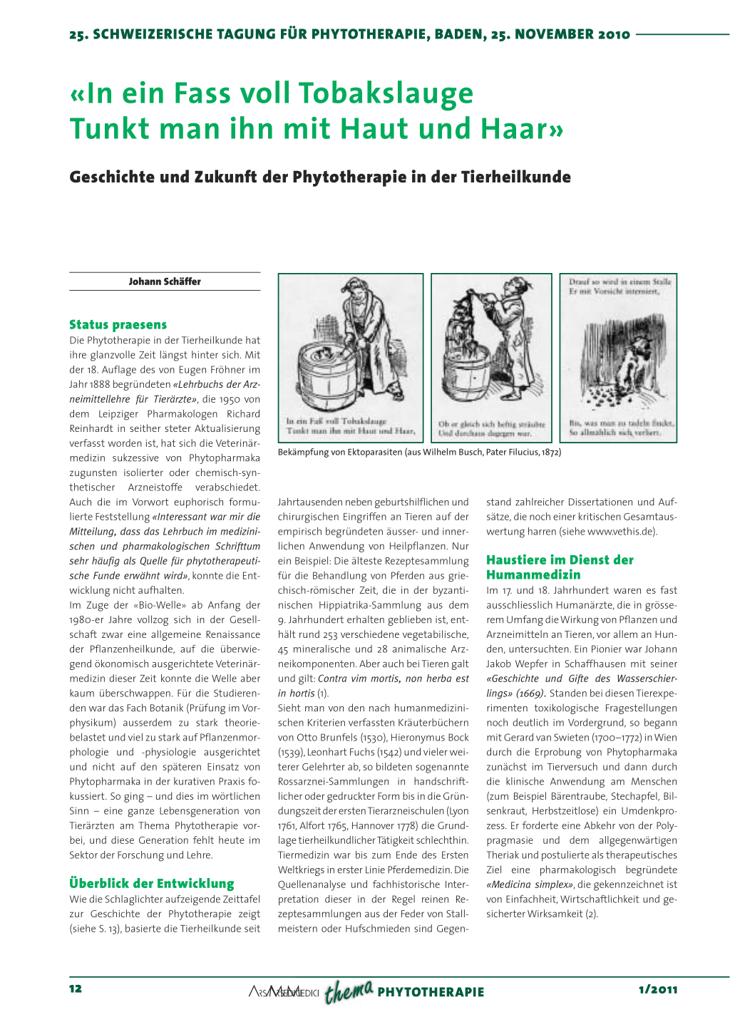 Plank in München mit seinem «Grundriss der Veterinär-Botanik oder ThierarzneyPflanzenkunde» und 1870 Eduard Vogel in Stuttgart mit seinem «Taschenbuch der thierärztlichen Arzneimittellehre» den Massstab bis zur Erstauflage von Reinhard Fröhners «Lehrbuch der Arzneimittellehre für Thierärzte» von 1888. (3) «In ein Fass voll Tobakslauge / Tunkt man ihn mit Haut und Haar, / Ob er gleich sich heftig sträubte / Und durchaus dagegen war. // Drauf so wird in einem Stalle / Er mit Vorsicht interniert, / Bis, was man zu tadeln findet, / So allmählich sich verliert. //» Wilhelm Busch (1872): Pater Filucius. – Bis zu diesem Jahr, in dem die Gewerbeordnung des Deutschen Reichs in Kraft trat, war der Titel «Tierarzt» in Deutschland nicht geschützt.