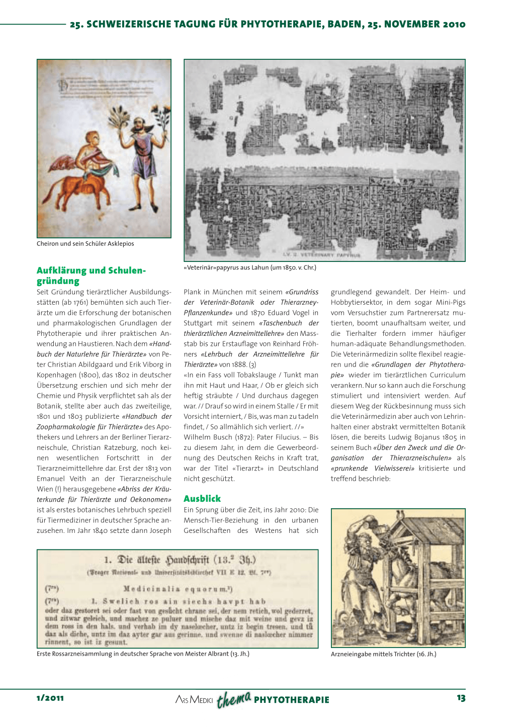 ?: Cheiron: Der in der griechischen Mythologie einzige unsterbliche Kentaur soll der Heilkunst kundig gewesen sein und im Peliongebirge (Thessalien) Heilkräuter gesammelt und angewendet haben. Er gilt als legendärer Begründer der Tierheilkunde und wurde Lehrmeister unter anderem des Asklepios. Das Primat der Tierheilkunde gegenüber der Humanmedizin ist ein mythologisches Faktum. Um 1850 v. Chr.: Der sogenannte Veterinärpapyrus von El-Lahun – das älteste Schriftzeugnis der Tierheilkunde – belegt, dass in Altägypten Heilpflanzen unter anderem für Einreibungen und Räucherungen bei Rindern verwendet wurden. 1400–1200 v. Chr.: Die ältesten Texte über Pferdeheilkunde, überliefert auf vier Tontafeln aus Ugarit (Nordsyrien), umfassen Vorschriften zur Auswahl von Heilpflanzen (z.B. Lattich) nach Qualitätskriterien und Anweisungen zum Zubereiten der Arzneien. Ab 2. Jh. v. Chr.: In den lateinischen Büchern «Über den Landbau» von Cato, Varro und Columella nimmt die Behandlung kranker Haustiere mit volkstümlichen Heilpflanzen, die in der Regel von den Hirten durchgeführt wurde, einen breiten Raum ein.