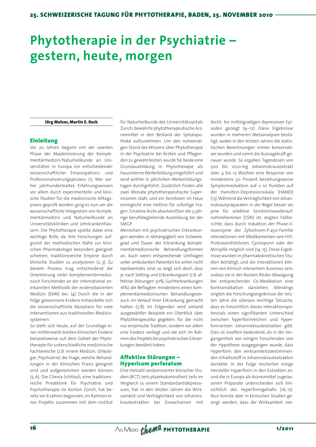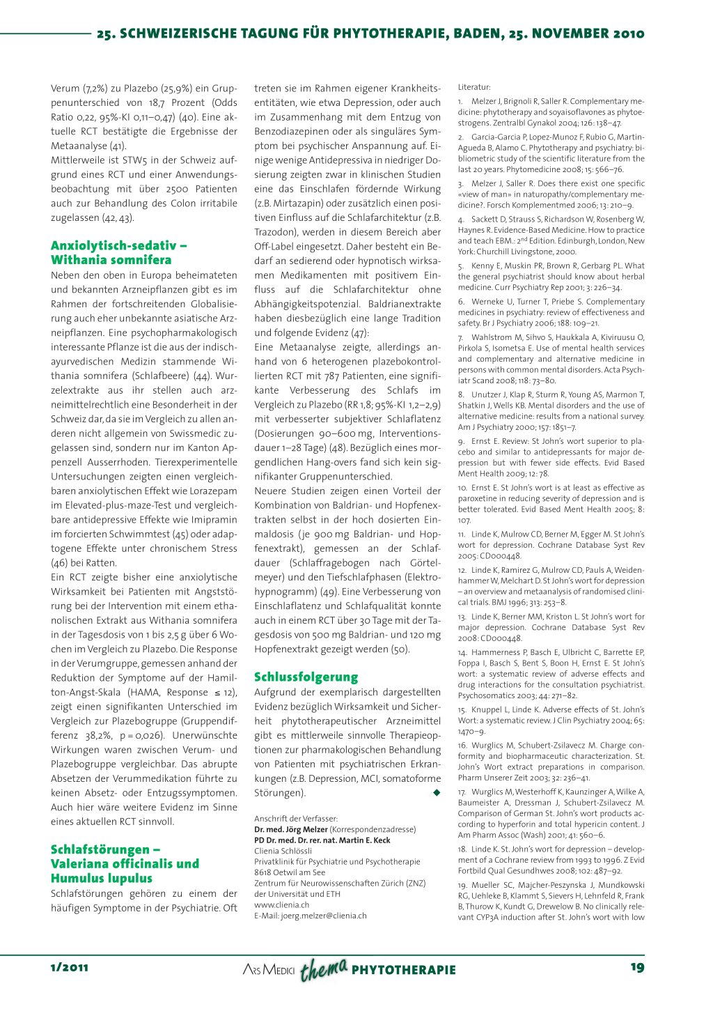 für Naturheilkunde des Universitätsspitals Zürich, bewährte phytotherapeutische Arzneimittel in den Bestand der Spitalapotheke aufzunehmen. Um den notwendigen Stand des Wissens über Phytotherapie in der Psychiatrie bei Ärzten und Pflegenden zu gewährleisten, wurde für beide eine Grundausbildung in Phytotherapie als hausinterne Weiterbildung eingeführt und wird seither in jährlichen Weiterbildungstagen durchgeführt. Zusätzlich finden alle zwei Monate phytotherapeutische Supervisionen statt, und ein Kernteam im Haus ermöglicht eine Hotline für sofortige Fragen. Einzelne Ärzte absolvier(t)en die 3-jährige berufsbegleitende Ausbildung bei der SMGP. Menschen mit psychiatrischen Erkrankungen wenden in Abhängigkeit von Schweregrad und Dauer der Erkrankung komplementärmedizinische Behandlungsformen an. Auch wenn entsprechende Umfragen unter ambulanten Patienten bis anhin nicht repräsentativ sind, so zeigt sich doch, dass je nach Setting und Erkrankungsart (z.B. affektive Störungen 50%; Suchterkrankungen 16%) die Befragten mindestens einen komplementärmedizinischen Behandlungsversuch im Verlauf ihrer Erkrankung gemacht hatten (7, 8). Im Folgenden wird anhand ausgewählter Beispiele ein Überblick über Phytotherapeutika gegeben, für die nicht nur empirische Tradition, sondern vor allem eine Evidenz vorliegt und die sich im Rahmen des Projekts bei psychiatrischen Erkrankungen bewährt haben.