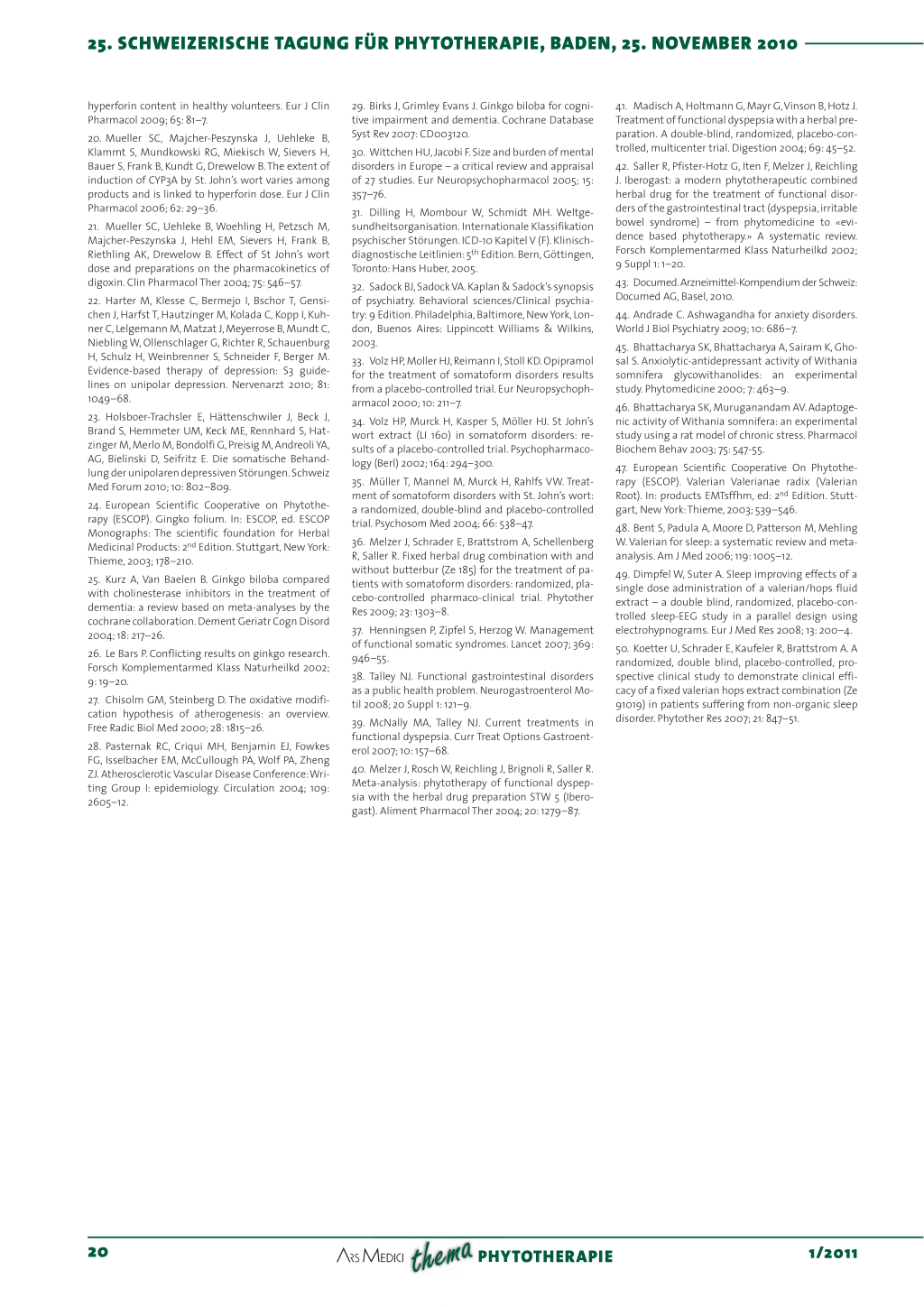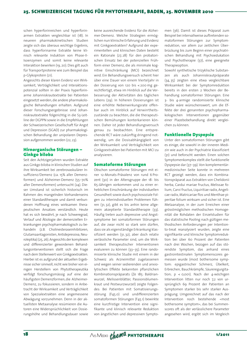 leicht- bis mittelgradigen depressiven Episoden gezeigt (9–12). Diese Ergebnisse wurden in mehreren Metaanalysen bestätigt, wobei in den letzten Jahren die statistischen Berechnungen immer konservativer wurden und somit die Aussagekraft genauer wurde. So ergaben Tagesdosen von 500 bis 1200 mg Johanniskrautextrakt über 4 bis 12 Wochen eine Response von mindestens 50 Prozent beziehungsweise Symptomreduktion auf < 10 Punkten auf der Hamilton-Depressionsskala (HAMD) (13).Während die Verträglichkeit von Johanniskrautpräparaten in der Regel besser als jene für selektive Serotoninwiederaufnahmehemmer (SSRI) ist, zeigten Fallberichte, dass durch Induktion der Phase-IIIsoenzyme der Zytochrom-P-450-Familie Interaktionen mit Medikamenten wie HIVProteaseinhibitoren, Cyclosporin oder der Minipille möglich sind (14, 15). Diese Ergebnisse wurden in pharmakokinetischen Studien bestätigt, und die Interaktionen können von klinisch relevantem Ausmass sein, sodass sie in der Nutzen-Risiko-Abwägung bei entsprechender Co-Medikation eine Kontraindikation darstellen. Allerdings zeigten die Forschungsergebnisse der letzten Jahre die überaus wichtige Tatsache, dass es hinsichtlich dieses Interaktionspotenzials einen signifikanten Unterschied zwischen hyperforinreichen und hyperforinarmen Johanniskrautextrakten gibt. Dies ist insofern bedeutend, als in der Vergangenheit von einigen Forschenden von der Hypothese ausgegangen wurde, dass Hyperforin den wirksamkeitsbestimmenden Inhaltsstoff in Johanniskrautextrakten darstelle. In der Folge reicherten einige Hersteller Hyperforin in den Extrakten an, und die in Europa als Arzneimittel zugelassenen Präparate unterscheiden sich hinsichtlich des Hyperforingehalts (16, 17). Nun konnte aber in klinischen Studien gezeigt werden, dass die Wirksamkeit zwi- thema16 PHYTOTHERAPIE 1/2011 25. SCHWEIZERISCHE TAGUNG FÜR PHYTOTHERAPIE, BADEN, 25. NOVEMBER 2010 schen hyperforinreichen und hyperforinarmen Extrakten vergleichbar ist (18). In neueren pharmakokinetischen Studien zeigte sich das überaus wichtige Ergebnis, dass hyperforinarme Extrakte keine klinisch relevante Induktion von Phase-IIIsoenzymen und somit keine relevante Interaktion bewirken (19, 20). Dies gilt auch für Transportproteine wie zum Beispiel das p-Glykoprotein (21). Angesichts dieser klaren Evidenz von Wirksamkeit, Verträglichkeit und Interaktionspotenzial sollten in der Praxis hyperforinarme Johanniskrautextrakte bei Patienten eingesetzt werden, die andere pharmakologische Behandlungen erhalten. Aufgrund dieser Forschungsergebnisse sind Johanniskrautextrakte folgerichtig in die S3-Leitline der DGPPN sowie in die Empfehlungen der Schweizerischen Gesellschaft für Angst und Depression (SGAD) zur pharmakologischen Behandlung der unipolaren Depression aufgenommen worden (22, 23). Hirnorganische Störungen – Ginkgo biloba Seit den Achtzigerjahren wurden Extrakte aus Ginkgo biloba in klinischen Studien auf ihre Wirksamkeit bei zerebrovaskulärer Insuffizienz/Demenz (ca. 15% aller Demenzformen) und Alzheimer-Demenz (55–70% aller Demenzformen) untersucht (24). Dieser Umstand ist sicherlich historisch im Rahmen des mangelnden Vorhandenseins einer Standardtherapie und damit verbundenen Hoffnung eines wirksamen therapeutischen Ansatzes verständlich. Heute hat es sich bewährt, je nach Schweregrad, Verlauf und Ätiologie der demenziellen Erkrankungen psychopharmakologisch zu behandeln (z.B. Cholinesteraseinhibitoren, Glutamaantagonisten, Antidepressiva, Neuroleptika) (25, 26). Angesichts der komplexen und differenzierter gewordenen Behandlungsinterventionen stellt sich die Frage nach dem Stellenwert von Ginkgoextrakten. Hierbei ist es aufgrund der aktuellen Ergebnisse sicher sinnvoll, nicht wie bisher von einigen Herstellern von Phytotherapeutika verfolgt forschungsmässig auf eine der häufigsten Demenzformen, die AlzheimerDemenz, zu fokussieren, sondern in Anbetracht der Wirksamkeit und Verträglichkeit von Spezialextrakten eine angemessene Abwägung vorzunehmen. Denn in der aktuellsten Metaanalyse resümieren die Autoren eine Widersprüchlichkeit von Dosierungshöhe und Behandlungsdauer sowie keine ausreichende Evidenz für die Alzheimer-Demenz. Welche Strategien ermöglichen nun klinische Erfahrung und Evidenz mit Ginkgoextrakten? Aufgrund der experimentellen und klinischen Daten besteht ein Rationale (27, 28) für den probatorischen Einsatz bei der potenziellen Frühform einer Demenz, die als minimale kognitive Einschränkung (MCI) bezeichnet wird. Ein Behandlungsversuch scheint hier über eine Dauer von einem Vierteljahr in der Dosierung von 120 bis < 200 mg gerechtfertigt, etwa im Hinblick auf die Verbesserung der Aktivitäten des täglichen Lebens (29). In höheren Dosierungen ist eine erhöhte Nebenwirkungsrate offenbar auch im Hinblick auf Verwirrtheitszustände zu beachten, die die therapeutischen Bemühungen konterkarieren können. Daher ist jeder Behandlungsversuch genau zu beobachten. Eine entsprechende RCT wäre zukünftig dringend notwendig, um die Dosisabhängigkeit von der Wirksamkeit und Verträglichkeit von Ginkgoextrakten bei Patienten mit MCI zu analysieren. Somatoforme Störungen Obschon somatoforme Störungen mit einer 12-Monats-Prävalenz von rund 6 Prozent (30) in der Altersgruppe der 18- bis 65-Jährigen vorkommen und zu einer erheblichen Einschränkung der individuellen Gesundheit sowie durch psychosoziale Folgen zu interindividuellen Problemen führen (31, 32), gibt es bis anhin keine allgemein akzeptierte Standardtherapie (33). Häufig treten auch depressive und Angstsymptome bei somatoformen Störungen auf, die zwar nicht so stark sein dürfen, dass sie als eigenständige Erkrankung klassifiziert werden (31, 32), aber doch relativ verlässliche Parameter sind, um die Wirksamkeit therapeutischer Interventionen evaluieren zu können (33–35). Eine randomisierte klinische Studie mit einem in der Schweiz als Arzneimittel zugelassenen und wegen seiner sedierenden und anxiolyti