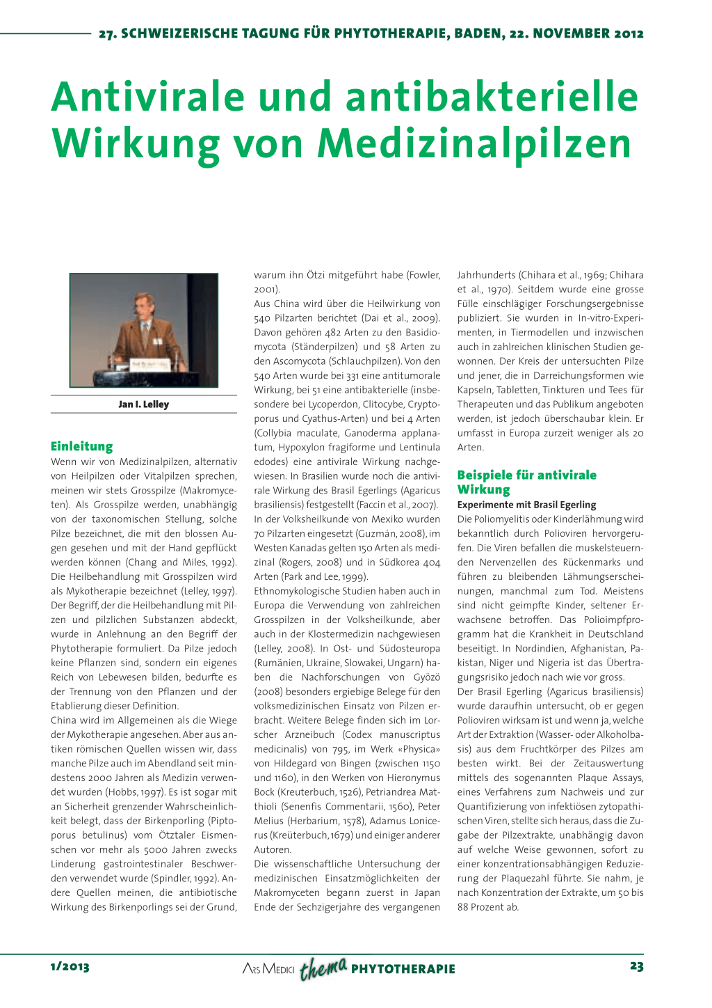 warum ihn Ötzi mitgeführt habe (Fowler, 2001). Aus China wird über die Heilwirkung von 540 Pilzarten berichtet (Dai et al., 2009). Davon gehören 482 Arten zu den Basidiomycota (Ständerpilzen) und 58 Arten zu den Ascomycota (Schlauchpilzen). Von den 540 Arten wurde bei 331 eine antitumorale Wirkung, bei 51 eine antibakterielle (insbesondere bei Lycoperdon, Clitocybe, Cryptoporus und Cyathus-Arten) und bei 4 Arten (Collybia maculate, Ganoderma applanatum, Hypoxylon fragiforme und Lentinula edodes) eine antivirale Wirkung nachgewiesen. In Brasilien wurde noch die antivirale Wirkung des Brasil Egerlings (Agaricus brasiliensis) festgestellt (Faccin et al., 2007). In der Volksheilkunde von Mexiko wurden 70 Pilzarten eingesetzt (Guzmán, 2008), im Westen Kanadas gelten 150 Arten als medizinal (Rogers, 2008) und in Südkorea 404 Arten (Park and Lee, 1999). Ethnomykologische Studien haben auch in Europa die Verwendung von zahlreichen Grosspilzen in der Volksheilkunde, aber auch in der Klostermedizin nachgewiesen (Lelley, 2008). In Ost- und Südosteuropa (Rumänien, Ukraine, Slowakei, Ungarn) haben die Nachforschungen von Gyözö (2008) besonders ergiebige Belege für den volksmedizinischen Einsatz von Pilzen erbracht. Weitere Belege finden sich im Lorscher Arzneibuch (Codex manuscriptus medicinalis) von 795, im Werk «Physica» von Hildegard von Bingen (zwischen 1150 und 1160), in den Werken von Hieronymus Bock (Kreuterbuch, 1526), Petriandrea Matthioli (Senenfis Commentarii, 1560), Peter Melius (Herbarium, 1578), Adamus Lonicerus (Kreüterbuch, 1679) und einiger anderer Autoren. Die wissenschaftliche Untersuchung der medizinischen Einsatzmöglichkeiten der Makromyceten begann zuerst in Japan Ende der Sechzigerjahre des vergangenen