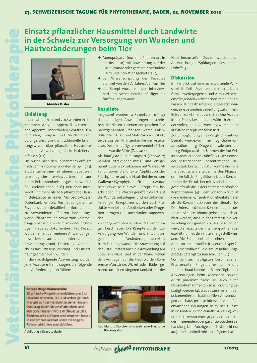 Im Hinblick auf eine zu erwartende Wirksamkeit dürfte Rezepten, die innerhalb der Familie weitergegeben und vom «Wissensempfangenden» selbst schon mit einer gewissen Mindesthäufigkeit eingesetzt wurden, eine besondere Bedeutung zukommen. Es ist anzunehmen, dass sich solche Rezepte in der Praxis besonders bewährt haben. In der vorliegenden Auswertung wurde daher auf diese Rezepturen fokussiert. Zur Ermöglichung eines Vergleichs mit der Literatur wurde,wo immer möglich,die Konzentration in g Drogenäquivalenten pro 100 g Endprodukt im Rahmen der Vor-OrtInterviews erhoben (Tabelle 4). Der Bereich der beschriebenen Konzentrationen variierte stark. Ein Grund dafür könnte die hohe therapeutische Breite der meisten Pflanzen sein. Im Fall der Ringelblume ist die Konzentration der Extraktion mit Alkohol um einiges tiefer als die in der Literatur empfohlene Konzentration (4). Beim Johanniskraut ist die erhobene Konzentration ebenfalls tiefer als die Konzentration aus der Literatur (5). Der Unterschied in den Konzentrationen des Johanniskrautes könnte jedoch dadurch erklärt werden, dass in der Literatur die Verwendung des ganzen Krautes beschrieben wird, die Rezepte der Interviewpartner aber explizit nur mit den Blüten hergestellt wurden. Die Blüten enthalten einen höheren Anteil an Inhaltsstoffen (Hypericin, Hyperforin, Amentoflavon), die am Wundheilungsprozess beteiligt zu sein scheinen (6, 7). Von den am häufigsten beschriebenen Pflanzenarten Ringelblume, Kamille und Johanniskraut konnte die Sinnhaftigkeit der Anwendungen beim Menschen sowohl durch pharmazeutische als auch durch klinisch-humanmedizinische Forschung bestätigt werden (4), was zusammen mit den dokumentierten traditionellen Anwendungen durchaus positive Rückschlüsse auf zu erwartende Wirkungen beim Tier zulässt. Insbesondere in der Wundbehandlung weisen Pflanzenauszüge gegenüber der rein desinfizierenden oder gar antibiotischen Behandlung klare Vorzüge auf, da sie nicht nur aufgrund antimikrobieller Eigenschaften