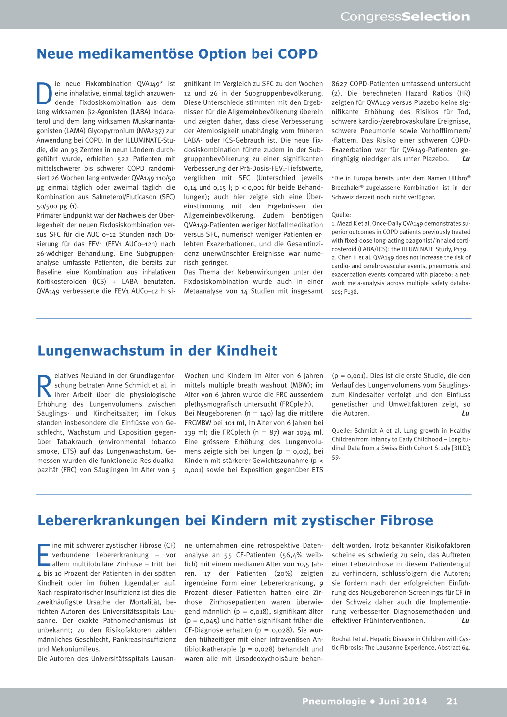 gnifikant im Vergleich zu SFC zu den Wochen 12 und 26 in der Subgruppenbevölkerung. Diese Unterschiede stimmten mit den Ergebnissen für die Allgemeinbevölkerung überein und zeigten daher, dass diese Verbesserung der Atemlosigkeit unabhängig vom früheren LABA- oder ICS-Gebrauch ist. Die neue Fixdosiskombination führte zudem in der Subgruppenbevölkerung zu einer signifikanten Verbesserung der Prä-Dosis-FEV1-Tiefstwerte, verglichen mit SFC (Unterschied jeweils 0,14 und 0,15 l; p < 0,001 für beide Behandlungen); auch hier zeigte sich eine Übereinstimmung mit den Ergebnissen der Allgemeinbevölkerung. Zudem benötigen QVA149-Patienten weniger Notfallmedikation versus SFC, numerisch weniger Patienten erlebten Exazerbationen, und die Gesamtinzidenz unerwünschter Ereignisse war numerisch geringer. Das Thema der Nebenwirkungen unter der Fixdosiskombination wurde auch in einer Metaanalyse von 14 Studien mit insgesamt 8627 COPD-Patienten umfassend untersucht (2). Die berechneten Hazard Ratios (HR) zeigten für QVA149 versus Plazebo keine signifikante Erhöhung des Risikos für Tod, schwere kardio-/zerebrovaskuläre Ereignisse, schwere Pneumonie sowie Vorhofflimmern/ -flattern. Das Risiko einer schweren COPDExazerbation war für QVA149-Patienten geringfügig niedriger als unter Plazebo. Lu *Die in Europa bereits unter dem Namen Ultibro® Breezhaler® zugelassene Kombination ist in der Schweiz derzeit noch nicht verfügbar. Quelle: 1. Mezzi K et al. Once-Daily QVA149 demonstrates superior outcomes in COPD patients previously treated with fixed-dose long-acting b2agonist/inhaled corticosteroid (LABA/ICS): the ILLUMINATE Study, P139. 2. Chen H et al. QVA149 does not increase the risk of cardio- and cerebrovascular events, pneumonia and exacerbation events compared with placebo: a network meta-analysis across multiple safety databases; P138. Lungenwachstum in der Kindheit R elatives Neuland in der Grundlagenforschung betraten Anne Schmidt et al. in ihrer Arbeit über die physiologische Erhöhung des Lungenvolumens zwischen Säuglings- und Kindheitsalter; im Fokus standen insbesondere die Einflüsse von Geschlecht, Wachstum und Exposition gegenüber Tabakrauch (environmental tobacco smoke, ETS) auf das Lungenwachstum. Gemessen wurden die funktionelle Residualkapazität (FRC) von Säuglingen im Alter von 5 Wochen und Kindern im Alter von 6 Jahren mittels multiple breath washout (MBW); im Alter von 6 Jahren wurde die FRC ausserdem plethysmografisch untersucht (FRCpleth). Bei Neugeborenen (n = 140) lag die mittlere FRCMBW bei 101 ml, im Alter von 6 Jahren bei 139 ml; die FRCpleth (n = 87) war 1094 ml. Eine grössere Erhöhung des Lungenvolumens zeigte sich bei Jungen (p = 0,02), bei Kindern mit stärkerer Gewichtszunahme (p < 0,001) sowie bei Exposition gegenüber ETS (p = 0,001). Dies ist die erste Studie, die den Verlauf des Lungenvolumens vom Säuglings- zum Kindesalter verfolgt und den Einfluss genetischer und Umweltfaktoren zeigt, so die Autoren. Lu Quelle: Schmidt A et al. Lung growth in Healthy Children from Infancy to Early Childhood – Longitudinal Data from a Swiss Birth Cohort Study [BILD]; 59. Lebererkrankungen bei Kindern mit zystischer Fibrose E ine mit schwerer zystischer Fibrose (CF) verbundene Lebererkrankung – vor allem multilobuläre Zirrhose – tritt bei 4 bis 10 Prozent der Patienten in der späten Kindheit oder im frühen Jugendalter auf. Nach respiratorischer Insuffizienz ist dies die zweithäufigste Ursache der Mortalität, berichten Autoren des Universitätsspitals Lausanne. Der exakte Pathomechanismus ist unbekannt; zu den Risikofaktoren zählen männliches Geschlecht, Pankreasinsuffizienz und Mekoniumileus. Die Autoren des Universitätsspitals Lausan- ne unternahmen eine retrospektive Datenanalyse an 55 CF-Patienten (56,4% weiblich) mit einem medianen Alter von 10,5 Jahren. 17 der Patienten (20%) zeigten irgendeine Form einer Lebererkrankung, 9 Prozent dieser Patienten hatten eine Zirrhose. Zirrhosepatienten waren überwiegend männlich (p = 0,018), signifikant älter (p = 0,045) und hatten signifikant früher die CF-Diagnose erhalten (p = 0,028). Sie wurden frühzeitiger mit einer intravenösen Antibiotikatherapie (p = 0,028) behandelt und waren alle mit Ursodeoxycholsäure behan- delt worden. Trotz bekannter Risikofaktoren scheine es schwierig zu sein, das Auftreten einer Leberzirrhose in diesem Patientengut zu verhindern, schlussfolgern die Autoren; sie fordern nach der erfolgreichen Einfüh- rung des Neugeborenen-Screenings für CF in der Schweiz daher auch die Implementie- rung verbesserter Diagnosemethoden und effektiver Frühinterventionen. Lu Rochat I et al. Hepatic Disease in Children with Cystic Fibrosis: The Lausanne Experience, Abstract 64. Pneumologie • Juni 2014 21
