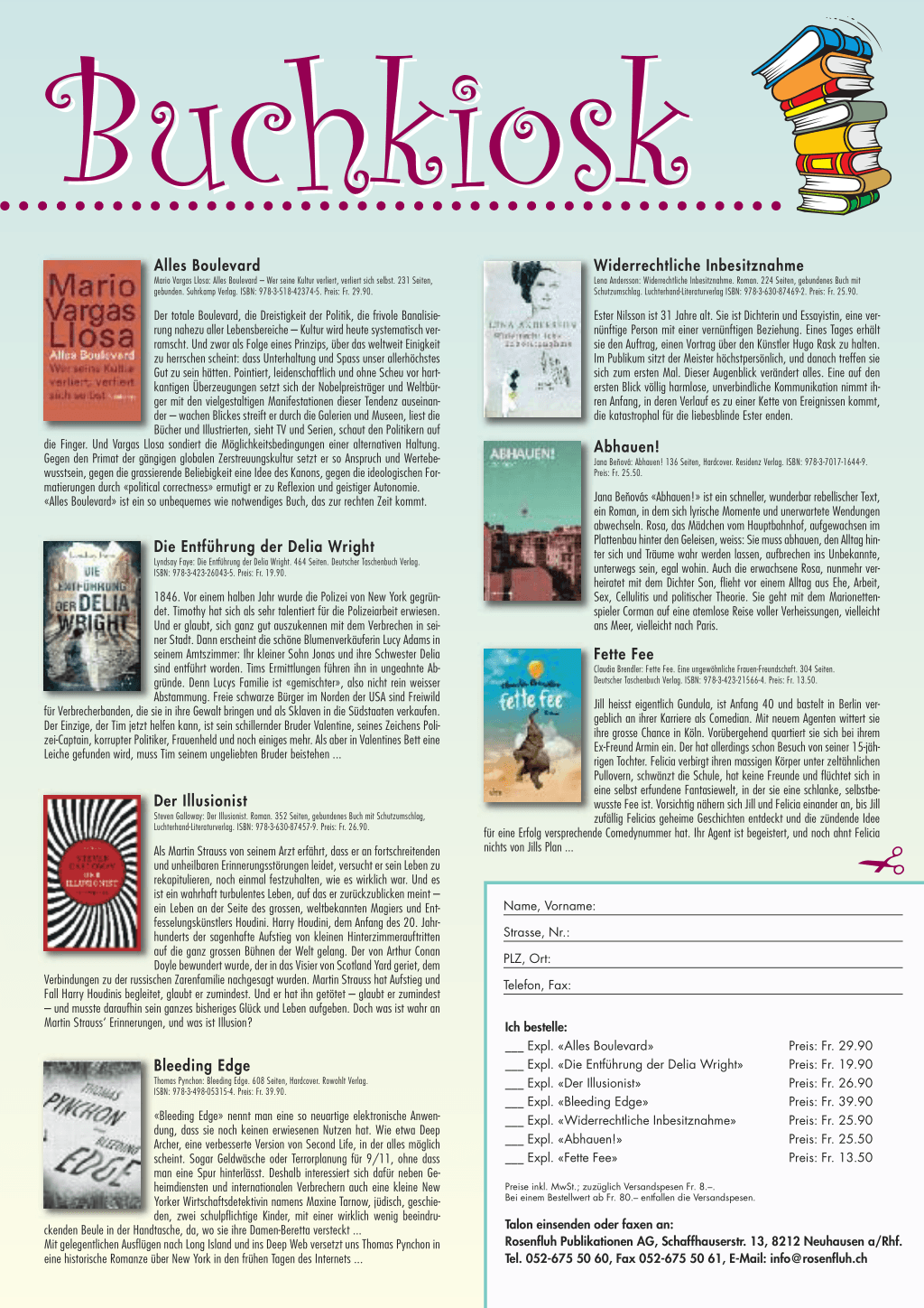Ich bestelle: ___ Expl. «Alles Boulevard» ___ Expl. «Die Entführung der Delia Wright» ___ Expl. «Der Illusionist» ___ Expl. «Bleeding Edge» ___ Expl. «Widerrechtliche Inbesitznahme» ___ Expl. «Abhauen!» ___ Expl. «Fette Fee»