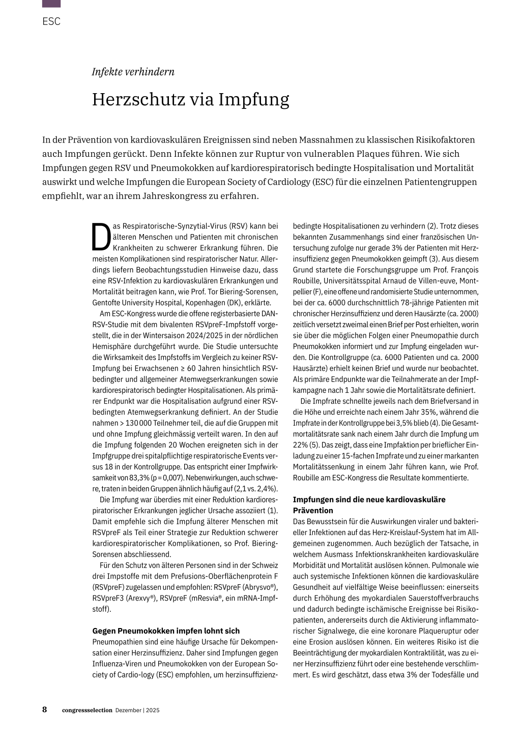 Am ESC-Kongress wurde die offene registerbasierte DANRSV-Studie mit dem bivalenten RSVpreF-Impfstoff vorgestellt, die in der Wintersaison 2024/2025 in der nördlichen Hemisphäre durchgeführt wurde. Die Studie untersuchte die Wirksamkeit des Impfstoffs im Vergleich zu keiner RSVImpfung bei Erwachsenen ≥ 60 Jahren hinsichtlich RSV- bedingter und allgemeiner Atemwegserkrankungen sowie kardiorespiratorisch bedingter Hospitalisationen. Als primärer Endpunkt war die Hospitalisation aufgrund einer RSVbedingten Atemwegserkrankung definiert. An der Studie nahmen > 130 000 Teilnehmer teil, die auf die Gruppen mit und ohne Impfung gleichmässig verteilt waren. In den auf die Impfung folgenden 20 Wochen ereigneten sich in der Impfgruppe drei spitalpflichtige respiratorische Events versus 18 in der Kontrollgruppe. Das entspricht einer Impfwirksamkeit von 83,3% (p = 0,007). Nebenwirkungen, auch schwere, traten in beiden Gruppen ähnlich häufig auf (2,1 vs. 2,4%).