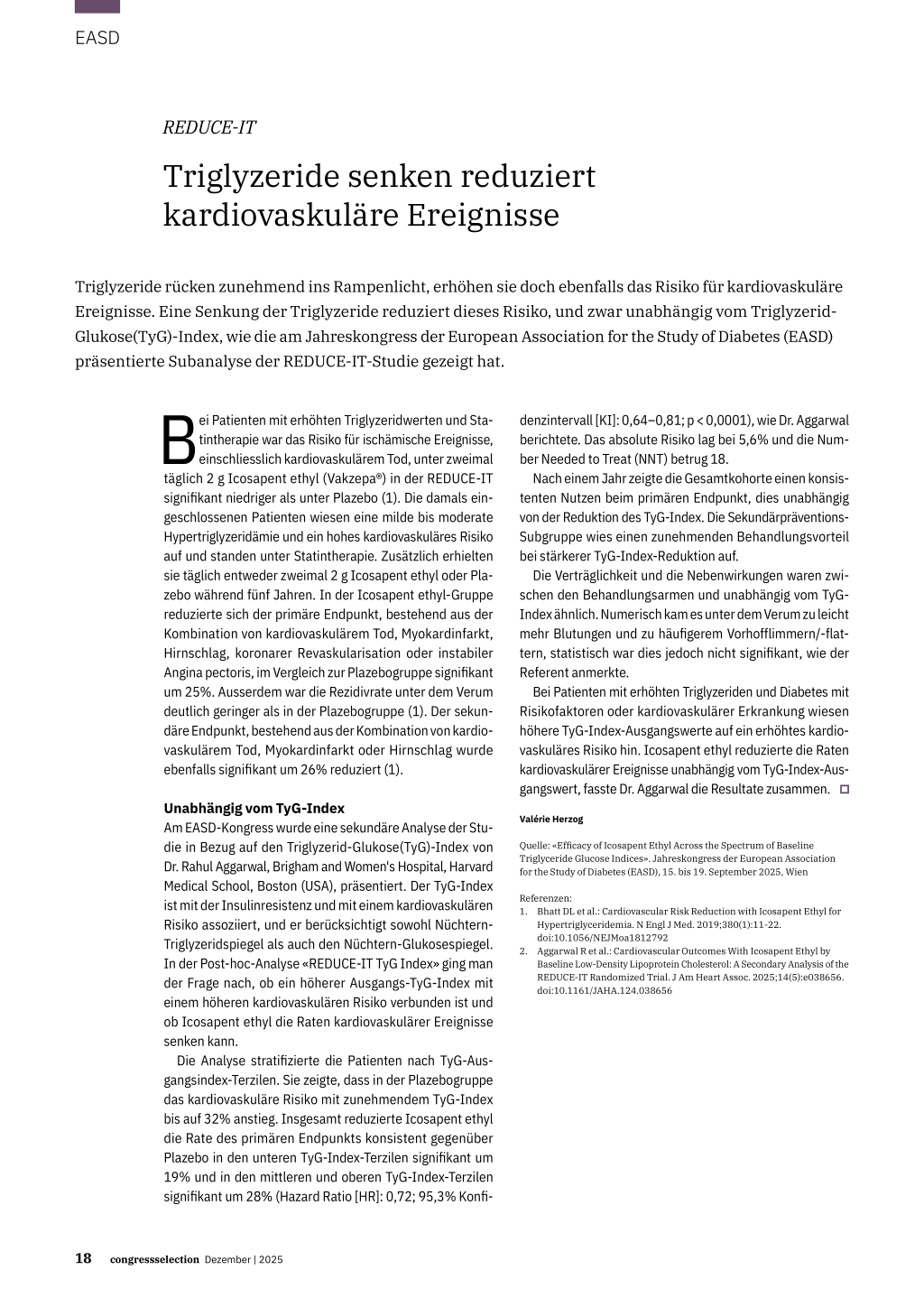 denzintervall [KI]: 0,64–0,81; p < 0,0001), wie Dr. Aggarwal berichtete. Das absolute Risiko lag bei 5,6% und die Number Needed to Treat (NNT) betrug 18. Nach einem Jahr zeigte die Gesamtkohorte einen konsistenten Nutzen beim primären Endpunkt, dies unabhängig von der Reduktion des TyG-Index. Die Sekundärpräventions-­ Subgruppe wies einen zunehmenden Behandlungsvorteil bei stärkerer TyG-Index-Reduktion auf. Die Verträglichkeit und die Nebenwirkungen waren zwischen den Behandlungsarmen und unabhängig vom TyGIndex ähnlich. Numerisch kam es unter dem Verum zu leicht mehr Blutungen und zu häufigerem Vorhofflimmern/-flattern, statistisch war dies jedoch nicht signifikant, wie der Referent anmerkte. Bei Patienten mit erhöhten Triglyzeriden und Diabetes mit Risikofaktoren oder kardiovaskulärer Erkrankung wiesen höhere TyG-Index-Ausgangswerte auf ein erhöhtes kardiovaskuläres Risiko hin. Icosapent ethyl reduzierte die Raten kardiovaskulärer Ereignisse unabhängig vom TyG-Index-Ausgangswert, fasste Dr. Aggarwal die Resultate zusammen. Valérie Herzog Quelle: «Efficacy of Icosapent Ethyl Across the Spectrum of Baseline Triglyceride Glucose Indices». Jahreskongress der European Association for the Study of Diabetes (EASD), 15. bis 19. September 2025, Wien Referenzen: 1. Bhatt DL et al.: Cardiovascular Risk Reduction with Icosapent Ethyl for Hypertriglyceridemia. N Engl J Med. 2019;380(1):11-22. doi:10.1056/NEJMoa1812792 2. Aggarwal R et al.: Cardiovascular Outcomes With Icosapent Ethyl by Baseline Low-Density Lipoprotein Cholesterol: A Secondary Analysis of the REDUCE-IT Randomized Trial. J Am Heart Assoc. 2025;14(5):e038656. doi:10.1161/JAHA.124.038656 18 congressselection Dezember | 2025