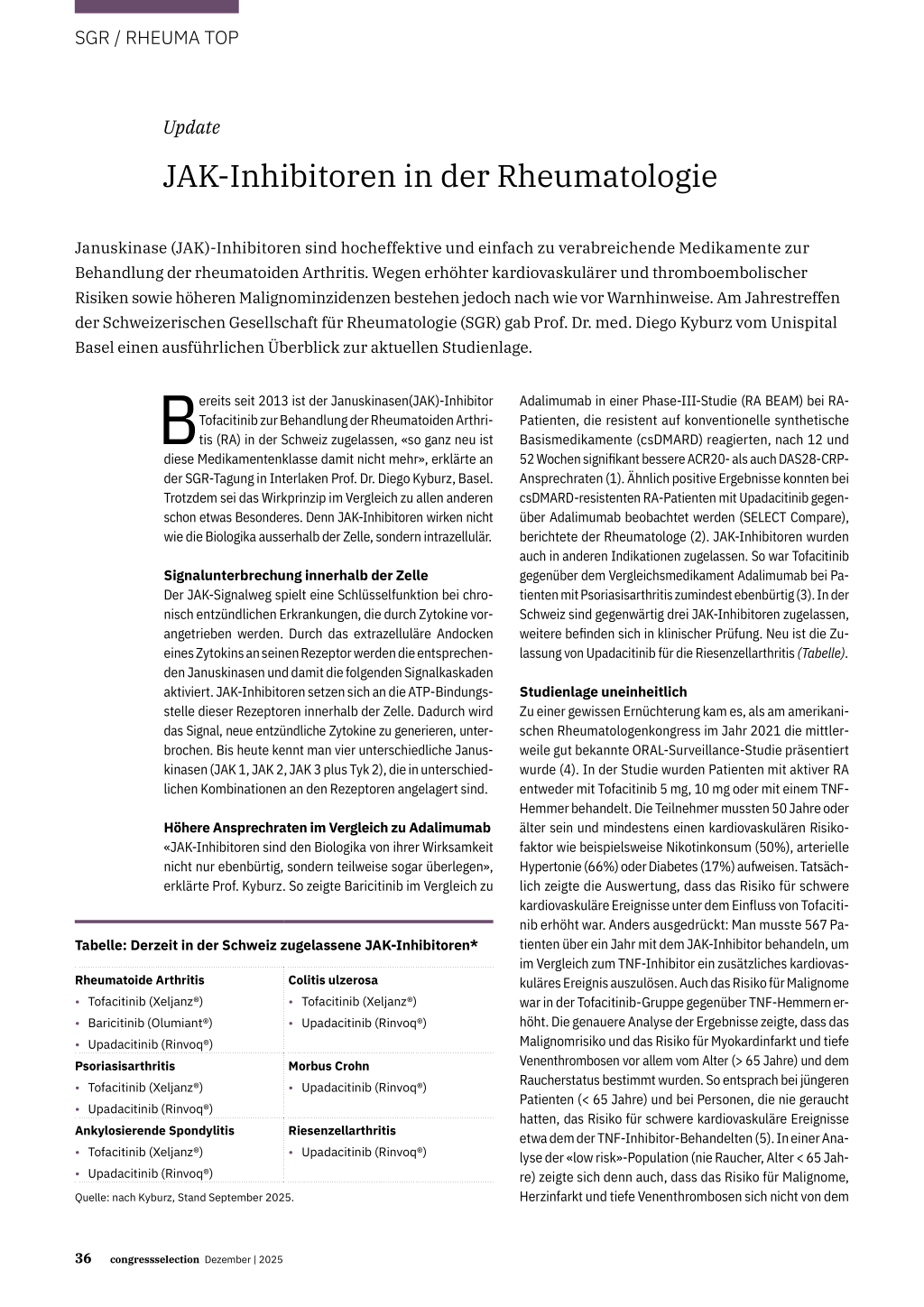 Zukunft für Januskinase-Inhibitoren Wie sieht nun die Zukunft der JAK-Inhibitoren aus? «Ich glaube nicht, dass man die Januskinasen trotz der Daten über ein erhöhtes kardiovaskuläres Risiko in Zukunft abschreiben wird», so Prof. Kyburz. «Wir werden neue JAK- Inhibitoren sehen, zusätzlich zu den bereits zugelassenen. Wir werden auch neue Indikationen für diese Wirkstoffgruppe bekommen, beispielsweise für Lupus erythematodes, Lupusnephritis oder das Sjögren-Syndrom. Auch Kombinationen mit anderen Medikamenten sind möglich. Es wird in Zukunft noch vieles hinzukommen, um die Therapien mit den JAK-Inhibitoren weiter zu optimieren.»