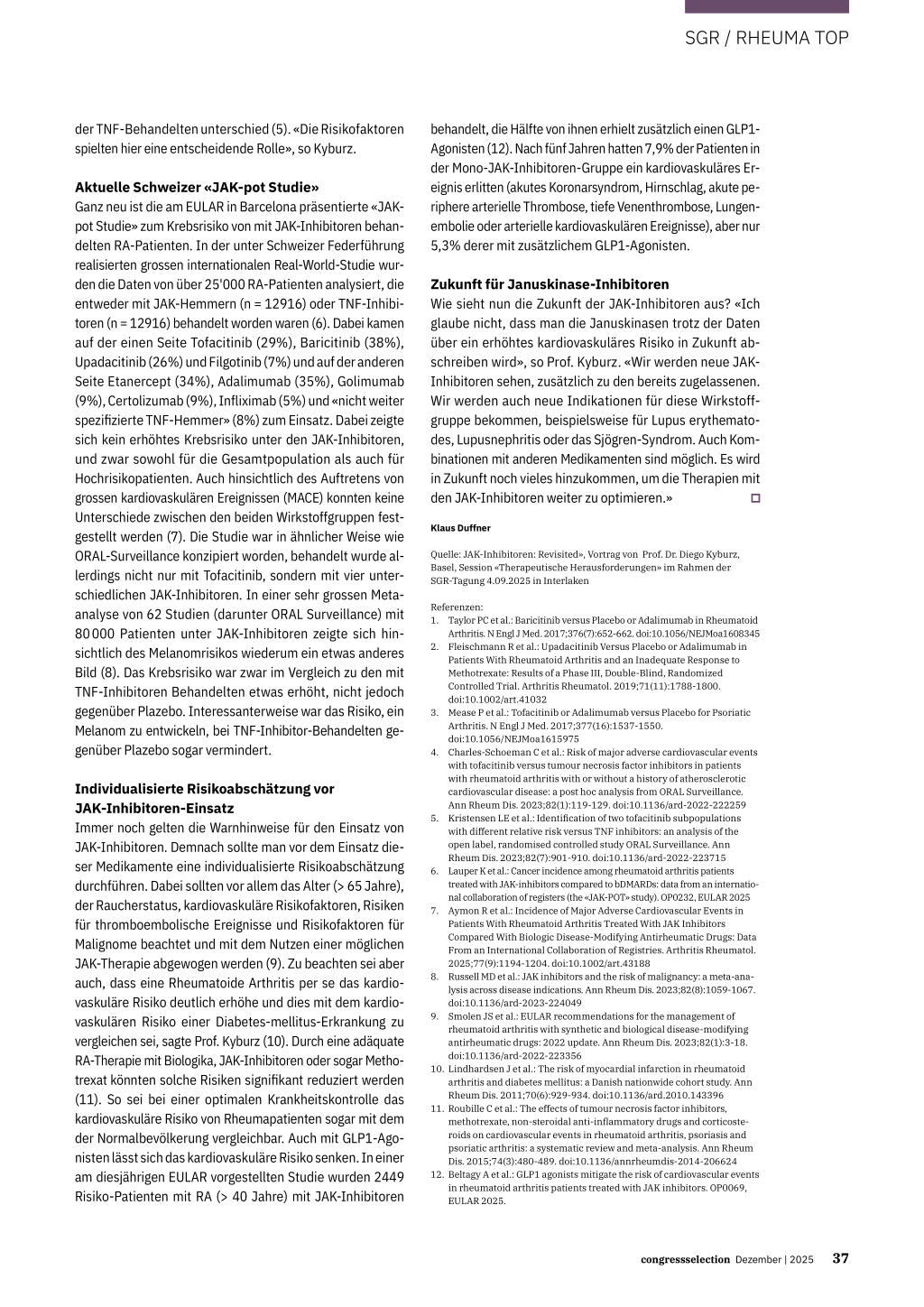 Patients With Rheumatoid Arthritis and an Inadequate Response to Methotrexate: Results of a Phase III, Double-Blind, Randomized Controlled Trial. Arthritis Rheumatol. 2019;71(11):1788-1800. doi:10.1002/art.41032 3. Mease P et al.: Tofacitinib or Adalimumab versus Placebo for Psoriatic Arthritis. N Engl J Med. 2017;377(16):1537-1550. doi:10.1056/NEJMoa1615975 4. Charles-Schoeman C et al.: Risk of major adverse cardiovascular events with tofacitinib versus tumour necrosis factor inhibitors in patients with rheumatoid arthritis with or without a history of atherosclerotic cardiovascular disease: a post hoc analysis from ORAL Surveillance. Ann Rheum Dis. 2023;82(1):119-129. doi:10.1136/ard-2022-222259 5. Kristensen LE et al.: Identification of two tofacitinib subpopulations with different relative risk versus TNF inhibitors: an analysis of the open label, randomised controlled study ORAL Surveillance. Ann Rheum Dis. 2023;82(7):901-910. doi:10.1136/ard-2022-223715 6. Lauper K et al.: Cancer incidence among rheumatoid arthritis patients treated with JAK-inhibitors compared to bDMARDs: data from an international collaboration of registers (the «JAK-POT» study). OP0232, EULAR 2025 7. Aymon R et al.: Incidence of Major Adverse Cardiovascular Events in Patients With Rheumatoid Arthritis Treated With JAK Inhibitors Compared With Biologic Disease-Modifying Antirheumatic Drugs: Data From an International Collaboration of Registries. Arthritis Rheumatol. 2025;77(9):1194-1204. doi:10.1002/art.43188 8. Russell MD et al.: JAK inhibitors and the risk of malignancy: a meta-analysis across disease indications. Ann Rheum Dis. 2023;82(8):1059-1067. doi:10.1136/ard-2023-224049 9. Smolen JS et al.: EULAR recommendations for the management of rheumatoid arthritis with synthetic and biological disease-modifying antirheumatic drugs: 2022 update. Ann Rheum Dis. 2023;82(1):3-18. doi:10.1136/ard-2022-223356 10. Lindhardsen J et al.: The risk of myocardial infarction in rheumatoid arthritis and diabetes mellitus: a Danish nationwide cohort study. Ann Rheum Dis. 2011;70(6):929-934. doi:10.1136/ard.2010.143396 11. Roubille C et al.: The effects of tumour necrosis factor inhibitors, methotrexate, non-steroidal anti-inflammatory drugs and corticosteroids on cardiovascular events in rheumatoid arthritis, psoriasis and psoriatic arthritis: a systematic review and meta-analysis. Ann Rheum Dis. 2015;74(3):480-489. doi:10.1136/annrheumdis-2014-206624 12. Beltagy A et al.: GLP1 agonists mitigate the risk of cardiovascular events in rheumatoid arthritis patients treated with JAK inhibitors. OP0069, EULAR 2025.