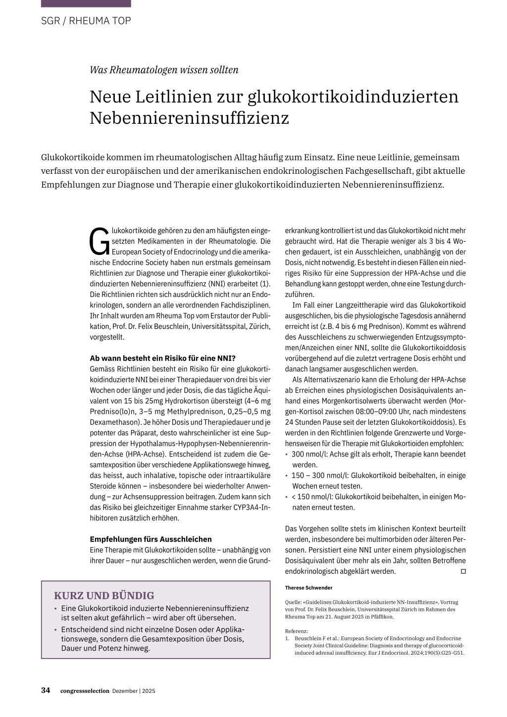 Wochen erneut testen. • < 150 nmol/l: Glukokortikoid beibehalten, in einigen Mo- naten erneut testen. Das Vorgehen sollte stets im klinischen Kontext beurteilt werden, insbesondere bei multimorbiden oder älteren Personen. Persistiert eine NNI unter einem physiologischen Dosisäquivalent über mehr als ein Jahr, sollten Betroffene endokrinologisch abgeklärt werden. Therese Schwender Quelle: «Guidelines Glukokortikoid-induzierte NN-Insuffizienz», Vortrag von Prof. Dr. Felix Beuschlein, Universitätsspital Zürich im Rahmen des Rheuma Top am 21. August 2025 in Pfäffikon. Referenz: 1. Beuschlein F et al.: European Society of Endocrinology and Endocrine Society Joint Clinical Guideline: Diagnosis and therapy of glucocorticoidinduced adrenal insufficiency. Eur J Endocrinol. 2024;190(5):G25-G51. 34 congressselection Dezember | 2025