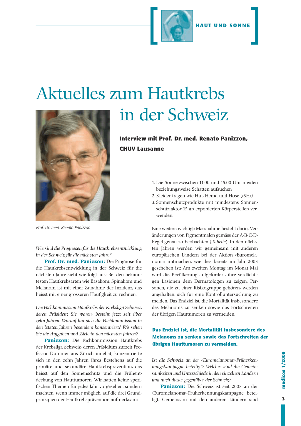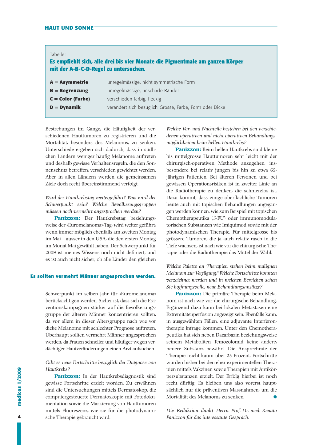 Eine weitere wichtige Massnahme besteht darin, Veränderungen von Pigmentmalen gemäss der A-B-C-DRegel genau zu beobachten (Tabelle). In den nächsten Jahren werden wir gemeinsam mit anderen europäischen Ländern bei der Aktion «Euromelanoma» mitmachen, wie dies bereits im Jahr 2008 geschehen ist: Am zweiten Montag im Monat Mai wird die Bevölkerung aufgefordert, ihre verdächtigen Läsionen dem Dermatologen zu zeigen. Personen, die zu einer Risikogruppe gehören, werden angehalten, sich für eine Kontrolluntersuchung zu melden. Das Endziel ist, die Mortalität insbesondere des Melanoms zu senken sowie das Fortschreiten der übrigen Hauttumoren zu vermeiden.
