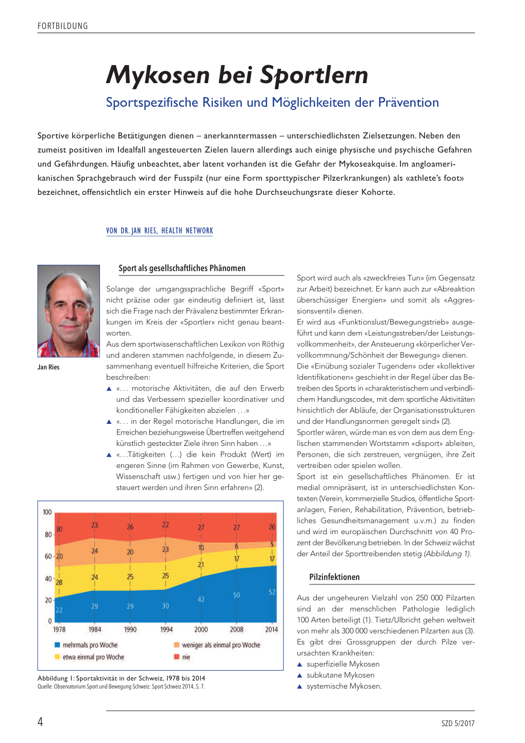 ten Sportkontext erfassende Präventions- und Therapieempfehlungen, sie profitieren – neben der ästhetischen Komponente – von einer schnelleren Regenerationsfähigkeit und damit einhergehend einer höheren Leistungsfähigkeit. b. Podologen erschliessen sich, neben den klassischen Behandlungen von diabetischen Füssen, einen neuen, attraktiven Markt (sowohl präventiv als auch therapiebegleitend) mit Selbstzahlern. c. Sportanbieter (kommerziell, kommunal oder vereinsgebunden) werden durch adäquate Hygieneumsetzung ihrer Verantwortung gegenüber den «Kunden» gerecht und steigern somit ihre Dienstleistungsqualität. d. Körperpflegemittelhersteller, können – falls die Wirksamkeit ihrer Produkte durch In-vivo- oder In-vitro-Studien nachgewiesen wurde – die Potenzen ihrer Produkte offensiv bewerben und sich somit Vorteile gegenüber fabulierenden Mitbewerbern («pflegt nachhaltig», «beugt … vor», …) verschaffen. Das «Damoklesschwert Mykosen» mitsamt dem «athlete’s foot» wird immer über den Sporttreibenden hängen, aber hoffentlich können Prävalenzen von über 80 Prozent in der Fussballbundesliga oder 60 Prozent bei Langstreckenläufern zukünftig durch Informationen und gut funktionierende interdisziplinäre Netzwerke ein wenig reduziert werden!