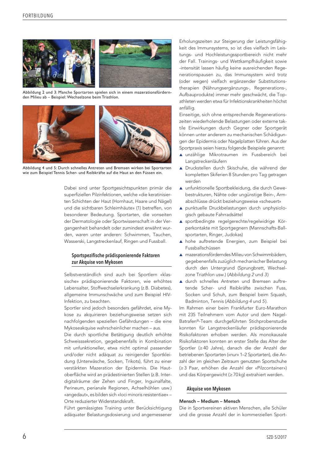 kompletten Skiferien 8 Stunden pro Tag getragen werden L unfunktionelle Sportbekleidung, die durch Gewebestrukturen, Nähte oder ungünstige Bein-, Armabschlüsse drückt beziehungsweise «scheuert» L punktuelle Druckbelastungen durch unphysiologisch gebaute Fahrradsättel L sportbedingte regelgerechte/regelwidrige Körperkontakte mit Sportgegnern (Mannschafts-Ballsportarten, Ringer, Judokas) L hohe auftretende Energien, zum Beispiel bei Fussballschüssen L mazerationsförderndes Milieu von Schwimmbädern, gegebenenfalls zuzüglich mechanischer Belastung durch den Untergrund (Sprungbrett, Wechselzone Triathlon usw.) (Abbildung 2 und 3 ) L durch schnelles Antreten und Bremsen auftretende Scher- und Reibkräfte zwischen Fuss, Socken und Schuh, zum Beispiel beim Squash, Badminton, Tennis (Abbildung 4 und 5 ). Im Rahmen einer beim Frankfurter Euro-Marathon mit 235 Teilnehmern vom Autor und dem NagelBatrafen®-Team durchgeführten Stichprobenstudie konnten für Langstreckenläufer prädisponierende Risikofaktoren erhoben werden. Als monokausale Risikofaktoren konnten an erster Stelle das Alter der Sportler (≥ 40 Jahre), danach die der Anzahl der betriebenen Sportarten («nur» 1–2 Sportarten), die Anzahl der im gleichen Zeitraum genutzten Sportschuhe (≥ 3 Paar, erhöhen die Anzahl der «Pilzcontainer») und das Körpergewicht (≥ 70 kg) extrahiert werden.