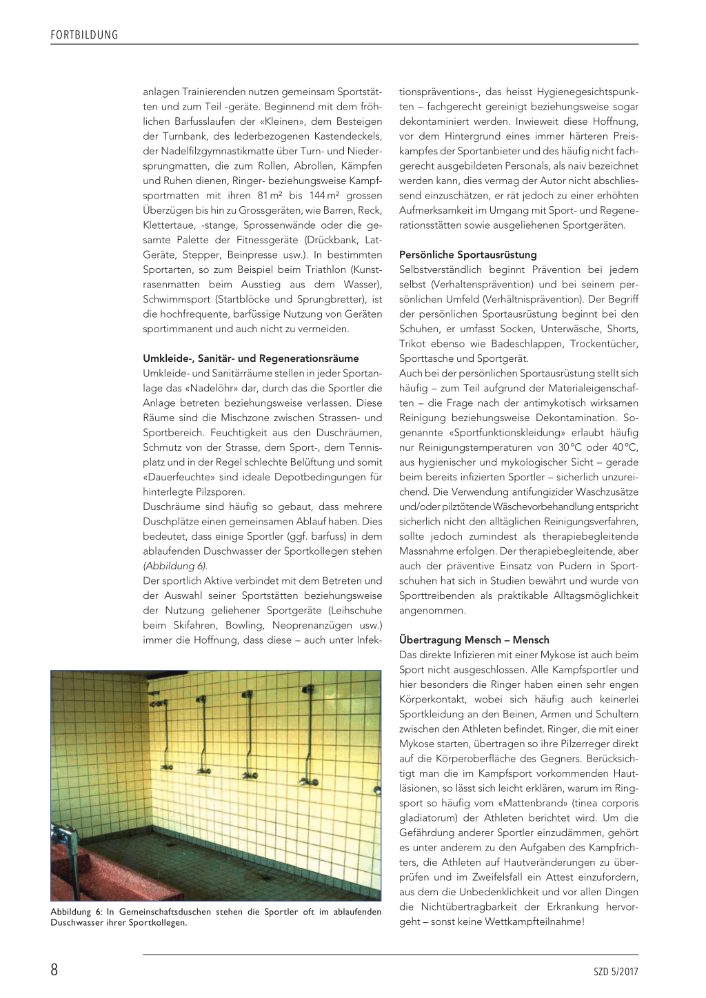 Umkleide-, Sanitär- und Regenerationsräume Umkleide- und Sanitärräume stellen in jeder Sportanlage das «Nadelöhr» dar, durch das die Sportler die Anlage betreten beziehungsweise verlassen. Diese Räume sind die Mischzone zwischen Strassen- und Sportbereich. Feuchtigkeit aus den Duschräumen, Schmutz von der Strasse, dem Sport-, dem Tennisplatz und in der Regel schlechte Belüftung und somit «Dauerfeuchte» sind ideale Depotbedingungen für hinterlegte Pilzsporen. Duschräume sind häufig so gebaut, dass mehrere Duschplätze einen gemeinsamen Ablauf haben. Dies bedeutet, dass einige Sportler (ggf. barfuss) in dem ablaufenden Duschwasser der Sportkollegen stehen (Abbildung 6). Der sportlich Aktive verbindet mit dem Betreten und der Auswahl seiner Sportstätten beziehungsweise der Nutzung geliehener Sportgeräte (Leihschuhe beim Skifahren, Bowling, Neoprenanzügen usw.) immer die Hoffnung, dass diese – auch unter Infek-