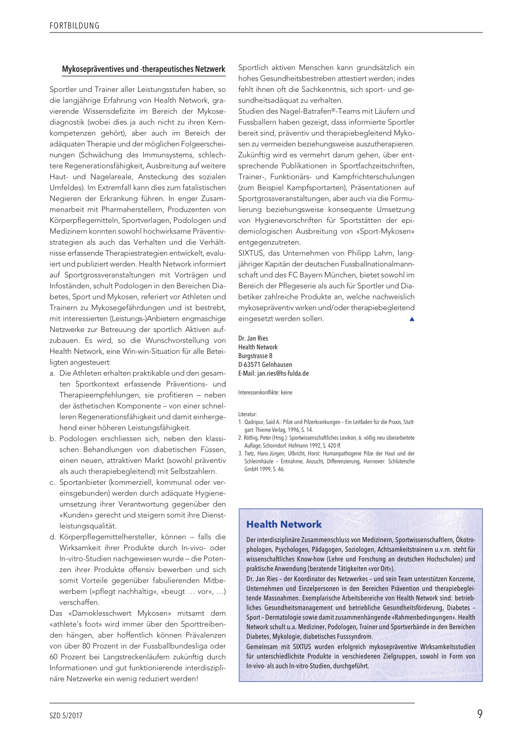 Der interdisziplinäre Zusammenschluss von Medizinern, Sportwissenschaftlern, Ökotrophologen, Psychologen, Pädagogen, Soziologen, Achtsamkeitstrainern u.v.m. steht für wissenschaftliches Know-how (Lehre und Forschung an deutschen Hochschulen) und praktische Anwendung (beratende Tätigkeiten «vor Ort»). Dr. Jan Ries – der Koordinator des Netzwerkes – und sein Team unterstützen Konzerne, Unternehmen und Einzelpersonen in den Bereichen Prävention und therapiebegleitende Massnahmen. Exemplarische Arbeitsbereiche von Health Network sind: betriebliches Gesundheitsmanagement und betriebliche Gesundheitsförderung, Diabetes – Sport – Dermatologie sowie damit zusammenhängende «Rahmenbedingungen». Health Network schult u.a. Mediziner, Podologen, Trainer und Sportverbände in den Bereichen Diabetes, Mykologie, diabetisches Fusssyndrom. Gemeinsam mit SIXTUS wurden erfolgreich mykosepräventive Wirksamkeitsstudien für unterschiedlichste Produkte in verschiedenen Zielgruppen, sowohl in Form von In-vivo- als auch In-vitro-Studien, durchgeführt.