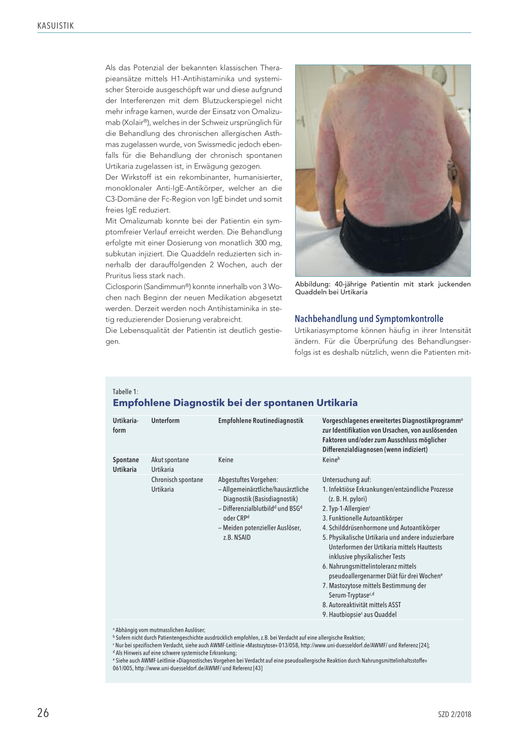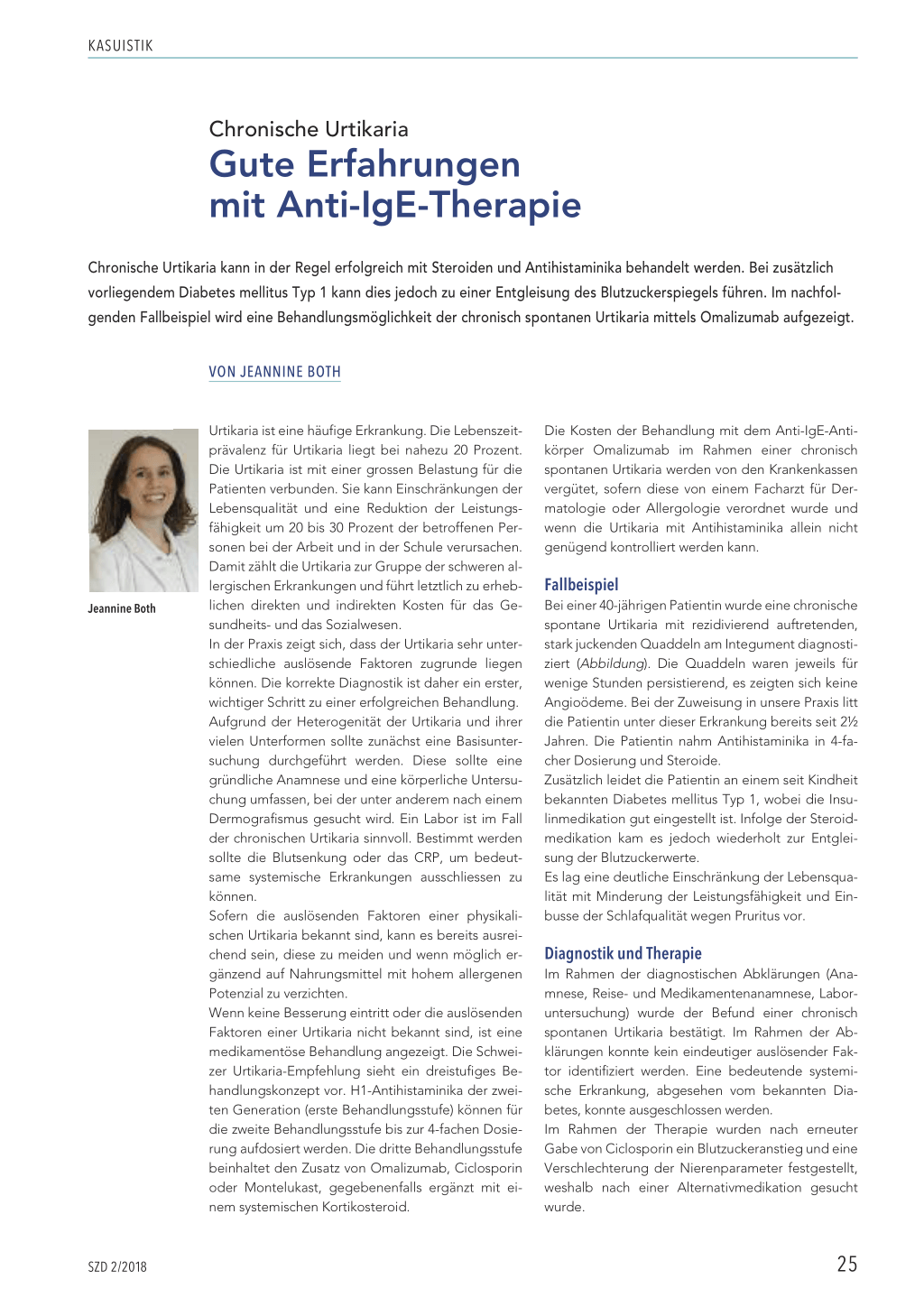 Als das Potenzial der bekannten klassischen Therapieansätze mittels H1-Antihistaminika und systemischer Steroide ausgeschöpft war und diese aufgrund der Interferenzen mit dem Blutzuckerspiegel nicht mehr infrage kamen, wurde der Einsatz von Omalizumab (Xolair®), welches in der Schweiz ursprünglich für die Behandlung des chronischen allergischen Asthmas zugelassen wurde, von Swissmedic jedoch ebenfalls für die Behandlung der chronisch spontanen Urtikaria zugelassen ist, in Erwägung gezogen. Der Wirkstoff ist ein rekombinanter, humanisierter, monoklonaler Anti-IgE-Antikörper, welcher an die C3-Domäne der Fc-Region von IgE bindet und somit freies IgE reduziert. Mit Omalizumab konnte bei der Patientin ein symptomfreier Verlauf erreicht werden. Die Behandlung erfolgte mit einer Dosierung von monatlich 300 mg, subkutan injiziert. Die Quaddeln reduzierten sich innerhalb der darauffolgenden 2 Wochen, auch der Pruritus liess stark nach. Ciclosporin (Sandimmun®) konnte innerhalb von 3 Wochen nach Beginn der neuen Medikation abgesetzt werden. Derzeit werden noch Antihistaminika in stetig reduzierender Dosierung verabreicht. Die Lebensqualität der Patientin ist deutlich gestiegen.