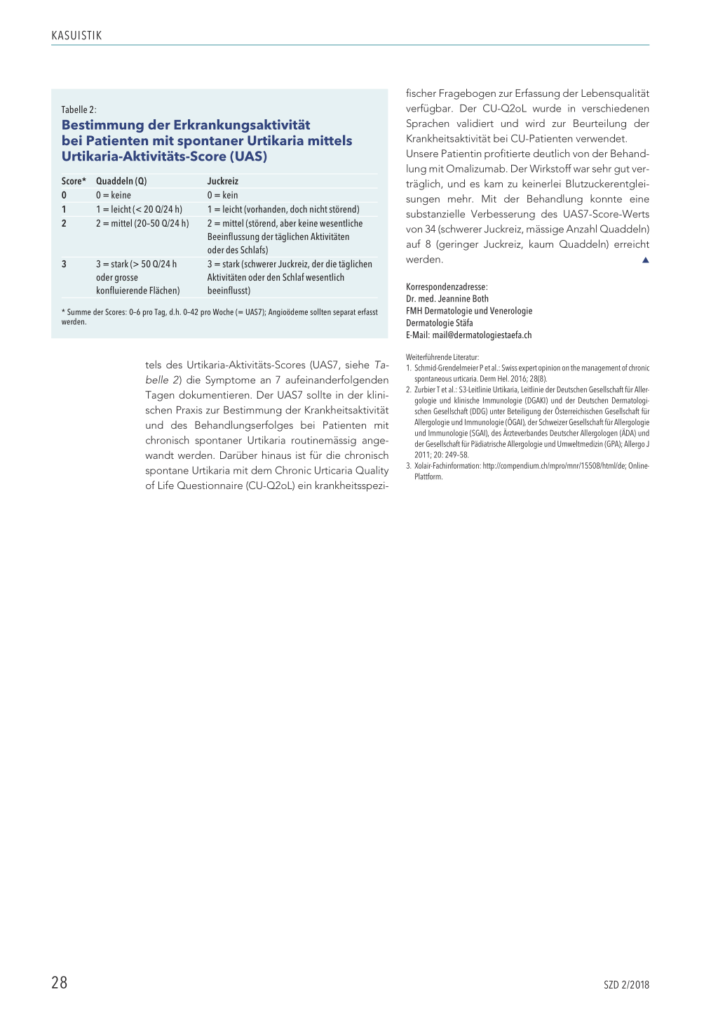 tels des Urtikaria-Aktivitäts-Scores (UAS7, siehe Tabelle 2) die Symptome an 7 aufeinanderfolgenden Tagen dokumentieren. Der UAS7 sollte in der klinischen Praxis zur Bestimmung der Krankheitsaktivität und des Behandlungserfolges bei Patienten mit chronisch spontaner Urtikaria routinemässig angewandt werden. Darüber hinaus ist für die chronisch spontane Urtikaria mit dem Chronic Urticaria Quality of Life Questionnaire (CU-Q2oL) ein krankheitsspezi-