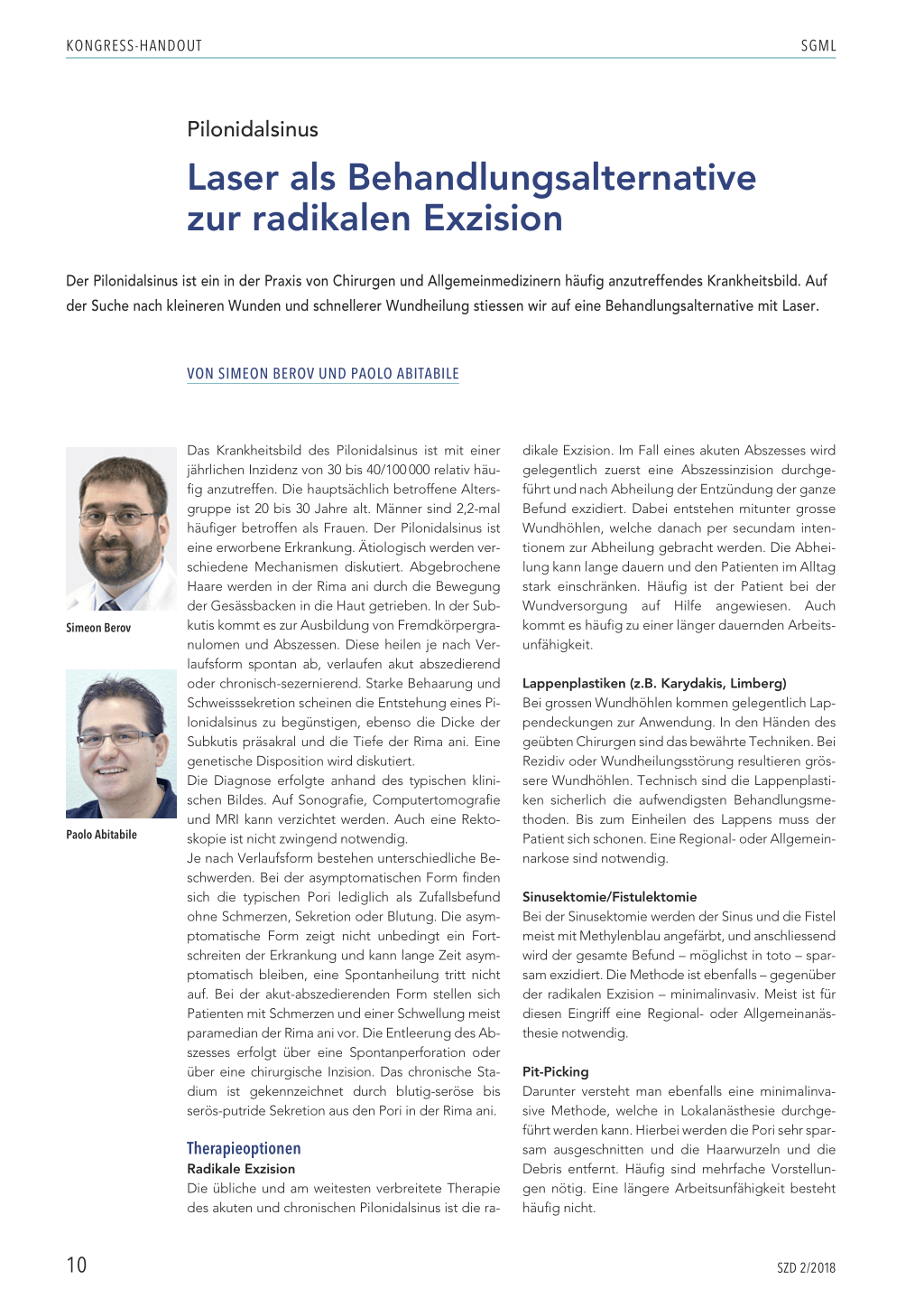Der Pilonidalsinus ist ein in der Praxis von Chirurgen und Allgemeinmedizinern häufig anzutreffendes Krankheitsbild. Auf der Suche nach kleineren Wunden und schnellerer Wundheilung stiessen wir auf eine Behandlungsalternative mit Laser.