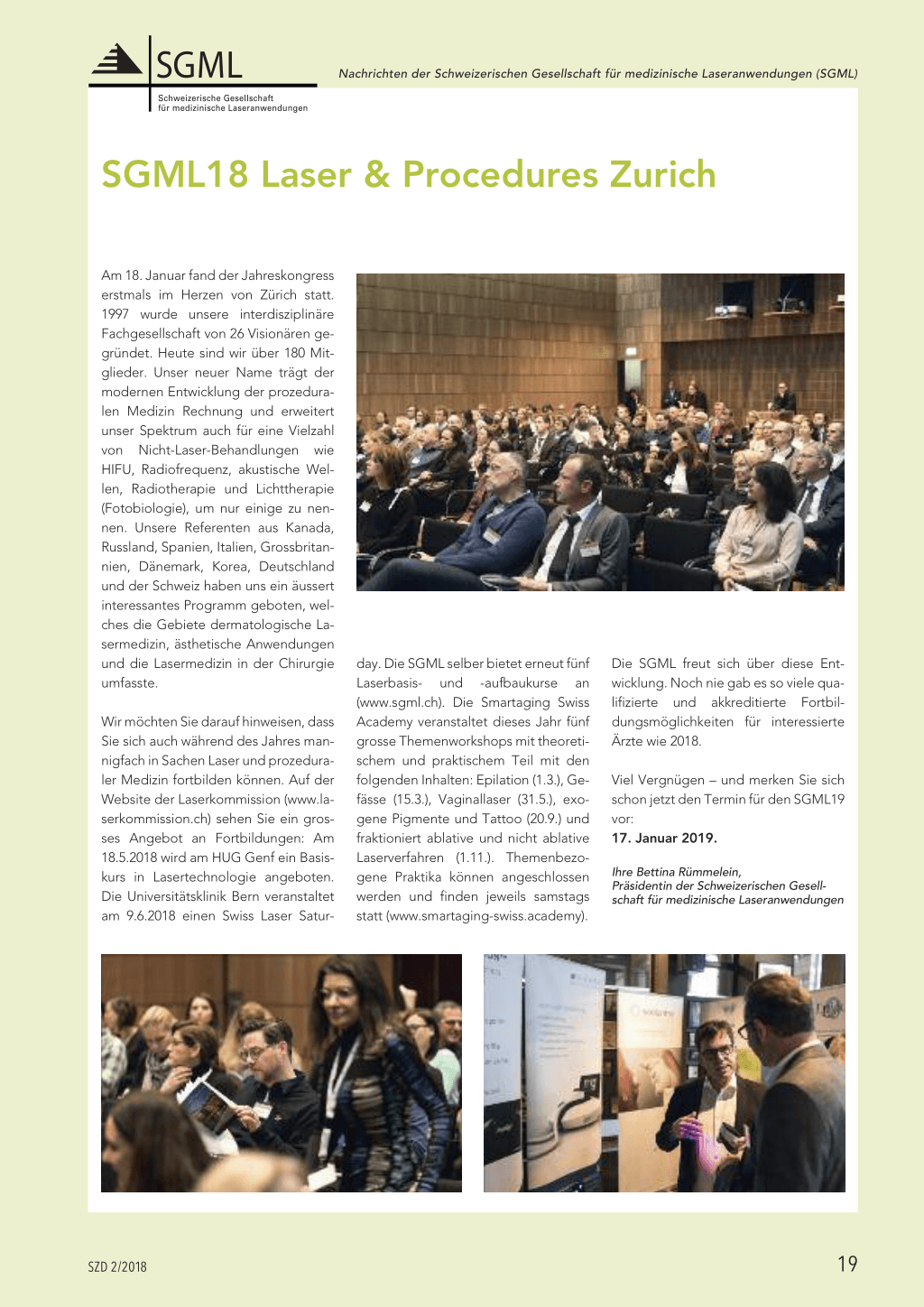 Am 18. Januar fand der Jahreskongress erstmals im Herzen von Zürich statt. 1997 wurde unsere interdisziplinäre Fachgesellschaft von 26 Visionären gegründet. Heute sind wir über 180 Mitglieder. Unser neuer Name trägt der modernen Entwicklung der prozeduralen Medizin Rechnung und erweitert unser Spektrum auch für eine Vielzahl von Nicht-Laser-Behandlungen wie HIFU, Radiofrequenz, akustische Wellen, Radiotherapie und Lichttherapie (Fotobiologie), um nur einige zu nennen. Unsere Referenten aus Kanada, Russland, Spanien, Italien, Grossbritannien, Dänemark, Korea, Deutschland und der Schweiz haben uns ein äussert interessantes Programm geboten, welches die Gebiete dermatologische Lasermedizin, ästhetische Anwendungen und die Lasermedizin in der Chirurgie umfasste.