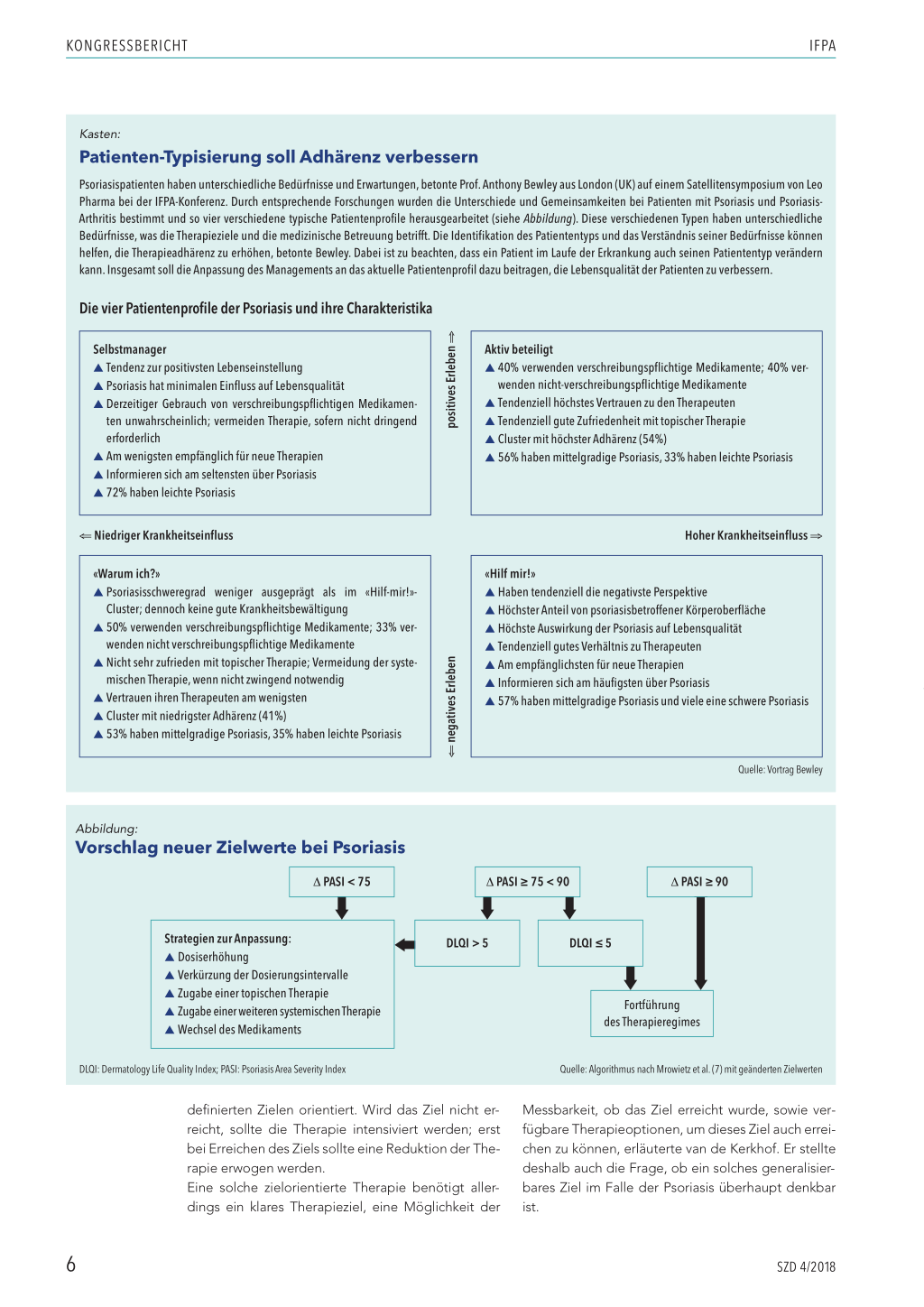 Psoriasispatienten haben unterschiedliche Bedürfnisse und Erwartungen, betonte Prof. Anthony Bewley aus London (UK) auf einem Satellitensymposium von Leo Pharma bei der IFPA-Konferenz. Durch entsprechende Forschungen wurden die Unterschiede und Gemeinsamkeiten bei Patienten mit Psoriasis und PsoriasisArthritis bestimmt und so vier verschiedene typische Patientenprofile herausgearbeitet (siehe Abbildung). Diese verschiedenen Typen haben unterschiedliche Bedürfnisse, was die Therapieziele und die medizinische Betreuung betrifft. Die Identifikation des Patiententyps und das Verständnis seiner Bedürfnisse können helfen, die Therapieadhärenz zu erhöhen, betonte Bewley. Dabei ist zu beachten, dass ein Patient im Laufe der Erkrankung auch seinen Patiententyp verändern kann. Insgesamt soll die Anpassung des Managements an das aktuelle Patientenprofil dazu beitragen, die Lebensqualität der Patienten zu verbessern.