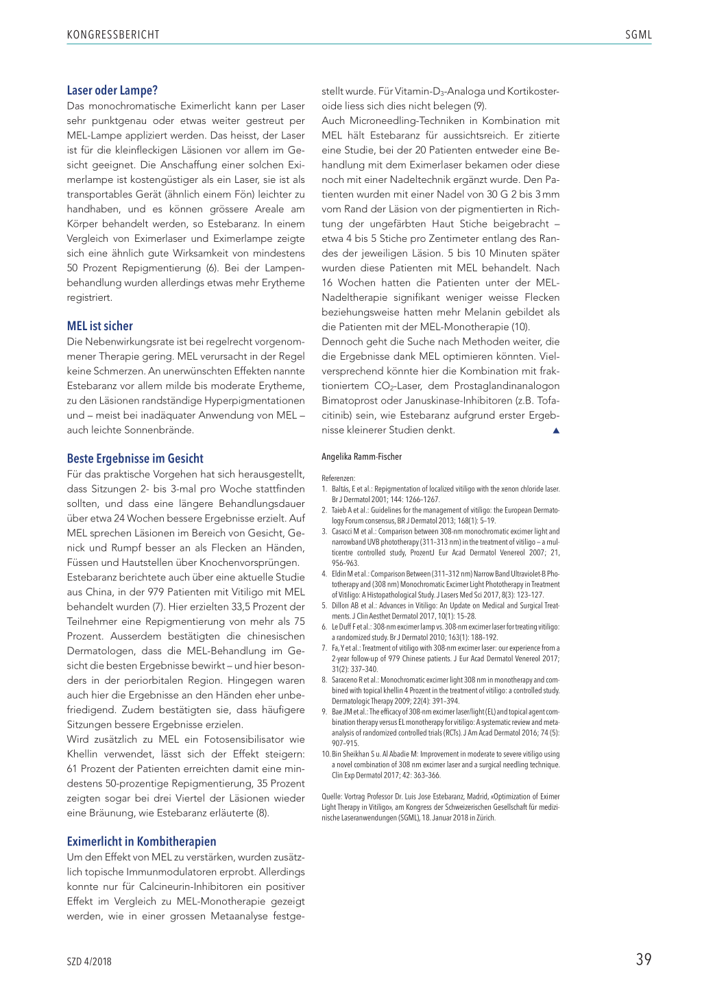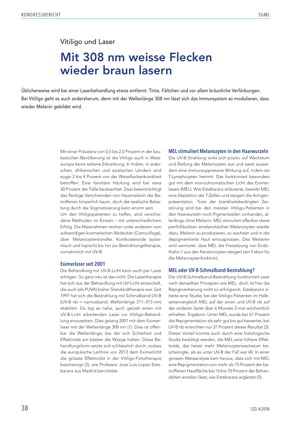 Quelle: Vortrag Professor Dr. Luis Jose Estebaranz, Madrid, «Optimization of Eximer Light Therapy in Vitiligo», am Kongress der Schweizerischen Gesellschaft für medizinische Laseranwendungen (SGML), 18. Januar 2018 in Zürich.