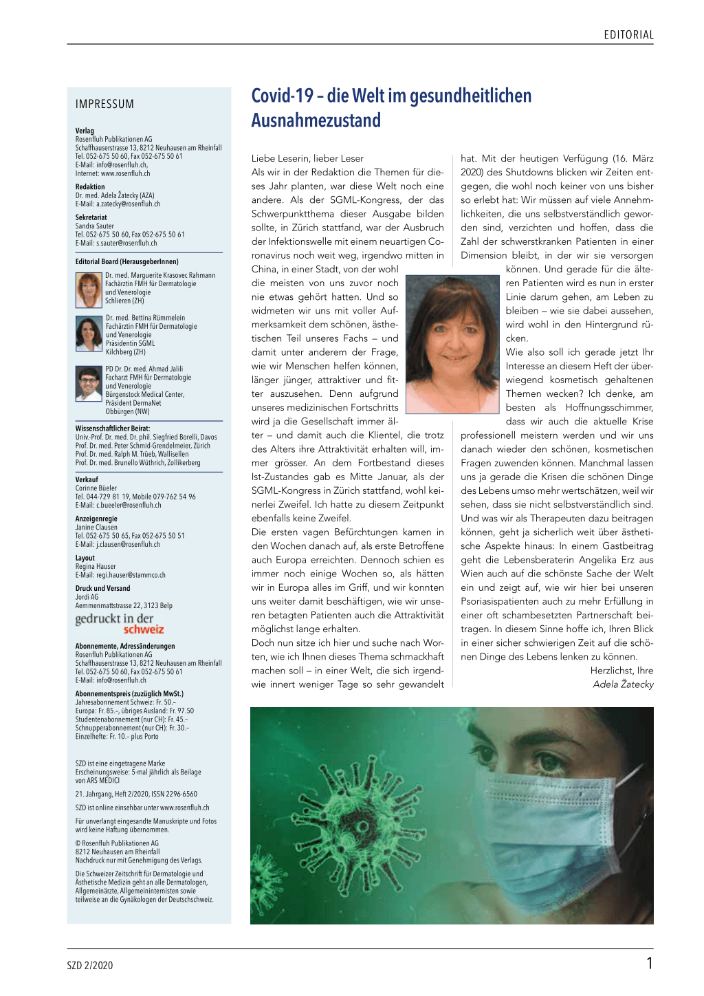 SZD ist eine eingetragene Marke Erscheinungsweise: 5-mal jährlich als Beilage von ARS MEDICI 21. Jahrgang, Heft 2/2020, ISSN 2296-6560 SZD ist online einsehbar unter www.rosenfluh.ch Für unverlangt eingesandte M anuskripte und Fotos wird keine Haftung ü bernommen. © Rosenfluh Publikationen AG 8212 Neuhausen am Rheinfall Nachdruck nur mit Genehmigung des Verlags. Die Schweizer Zeitschrift für Dermatologie und Ästhetische Medizin geht an alle Dermatologen, Allgemeinärzte, Allgemeininternisten s owie teilweise an die Gynäkologen der Deutschschweiz.