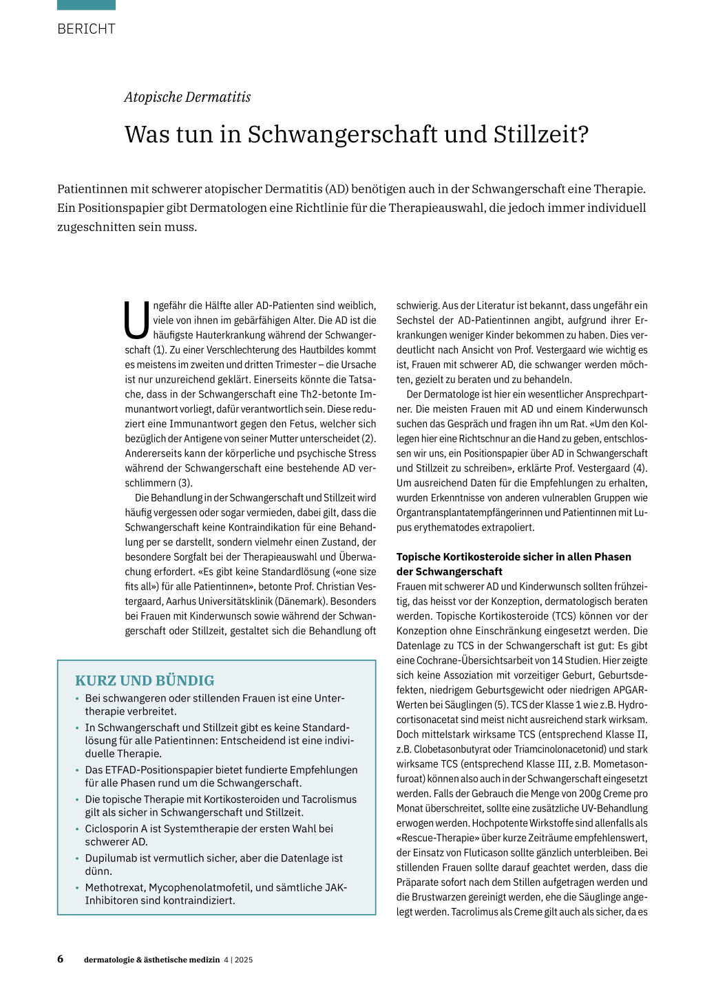 schwierig. Aus der Literatur ist bekannt, dass ungefähr ein Sechstel der AD-Patientinnen angibt, aufgrund ihrer Erkrankungen weniger Kinder bekommen zu haben. Dies verdeutlicht nach Ansicht von Prof. Vestergaard wie wichtig es ist, Frauen mit schwerer AD, die schwanger werden möchten, gezielt zu beraten und zu behandeln.