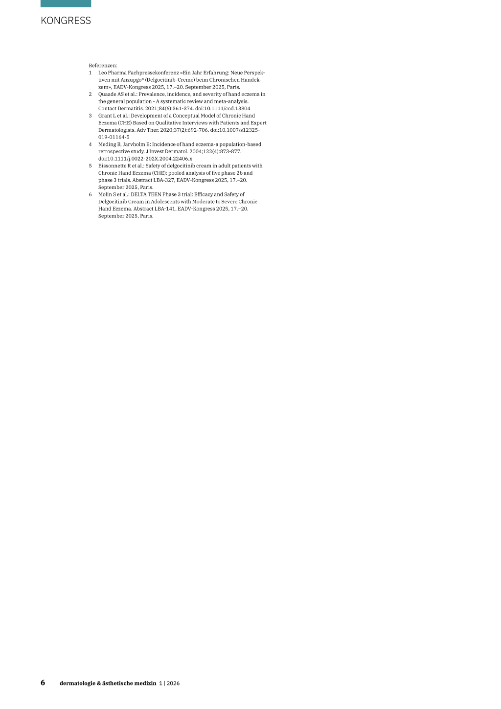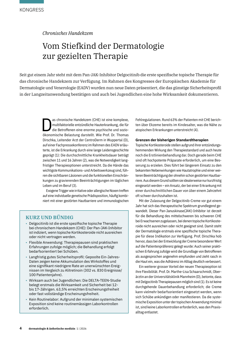 tiven mit Anzupgo® (Delgocitinib-Creme) beim Chronischen Handekzem», EADV-Kongress 2025, 17.–20. September 2025, Paris. 2 Quaade AS et al.: Prevalence, incidence, and severity of hand eczema in the general population - A systematic review and meta-analysis. Contact Dermatitis. 2021;84(6):361-374. doi:10.1111/cod.13804 3 Grant L et al.: Development of a Conceptual Model of Chronic Hand Eczema (CHE) Based on Qualitative Interviews with Patients and Expert Dermatologists. Adv Ther. 2020;37(2):692-706. doi:10.1007/s12325019-01164-5 4 Meding B, Järvholm B: Incidence of hand eczema-a population-based retrospective study. J Invest Dermatol. 2004;122(4):873-877. doi:10.1111/j.0022-202X.2004.22406.x 5 Bissonnette R et al.: Safety of delgocitinib cream in adult patients with Chronic Hand Eczema (CHE): pooled analysis of five phase 2b and phase 3 trials. Abstract LBA-327, EADV-Kongress 2025, 17.–20. September 2025, Paris. 6 Molin S et al.: DELTA TEEN Phase 3 trial: Efficacy and Safety of Delgocitinib Cream in Adolescents with Moderate to Severe Chronic Hand Eczema. Abstract LBA-141, EADV-Kongress 2025, 17.–20. September 2025, Paris.