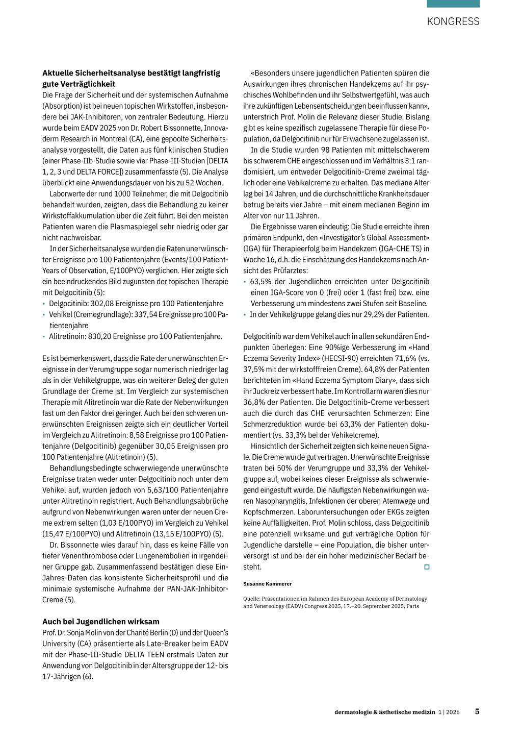 Aktuelle Sicherheitsanalyse bestätigt langfristig gute Verträglichkeit Die Frage der Sicherheit und der systemischen Aufnahme (Absorption) ist bei neuen topischen Wirkstoffen, insbesondere bei JAK-Inhibitoren, von zentraler Bedeutung. Hierzu wurde beim EADV 2025 von Dr. Robert Bissonnette, Innovaderm Research in Montreal (CA), eine gepoolte Sicherheitsanalyse vorgestellt, die Daten aus fünf klinischen Studien (einer Phase-IIb-Studie sowie vier Phase-III-Studien [DELTA 1, 2, 3 und DELTA FORCE]) zusammenfasste (5). Die Analyse überblickt eine Anwendungsdauer von bis zu 52 Wochen.