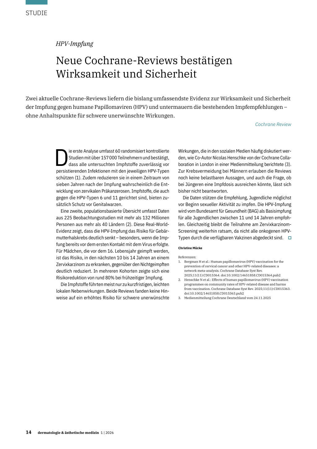 prevention of cervical cancer and other HPV-related diseases: a network meta-analysis. Cochrane Database Syst Rev. 2025;11(11):CD015364. doi:10.1002/14651858.CD015364.pub2 2. Henschke N et al.: Effects of human papillomavirus (HPV) vaccination programmes on community rates of HPV-related disease and harms from vaccination. Cochrane Database Syst Rev. 2025;11(11):CD015363. doi:10.1002/14651858.CD015363.pub2 3. Medienmitteilung Cochrane Deutschland vom 24.11.2025