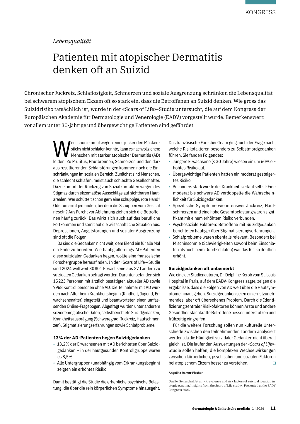 Das französische Forscher-Team ging auch der Frage nach, welche Risikofaktoren besonders zu Selbstmordgedanken führen. Sie fanden Folgendes: • Jüngere Erwachsene (< 30 Jahre) wiesen ein um 60% er- höhtes Risiko auf. • Übergewichtige Patienten hatten ein moderat gesteiger- tes Risiko. • Besonders stark wirkte der Krankheitsverlauf selbst: Eine moderat bis schwere AD verdoppelte die Wahrscheinlichkeit für Suizidgedanken. • Spezifische Symptome wie intensiver Juckreiz, Hautschmerzen und eine hohe Gesamtbelastung waren signifikant mit einem erhöhtem Risiko verbunden. • Psychosoziale Faktoren: Betroffene mit Suizidgedanken berichteten häufiger über Stigmatisierungserfahrungen. • Schlafprobleme waren ebenfalls relevant. Besonders bei Mischinsomnie (Schwierigkeiten sowohl beim Einschlafen als auch beim Durchschlafen) war das Risiko deutlich erhöht. Suizidgedanken oft unbemerkt Wie eine der Studienautoren, Dr. Delphine Kerob vom St. Louis Hospital in Paris, auf dem EADV-Kongress sagte, zeigen die Ergebnisse, dass die Folgen von AD weit über die Hautsymptome hinausgehen. Suizidgedanken seien ein ernstzunehmendes, aber oft übersehenes Problem. Durch die Identifizierung zentraler Risikofaktoren können Ärzte und andere Gesundheitsfachkräfte Betroffene besser unterstützen und frühzeitig eingreifen. Für die weitere Forschung sollen nun kulturelle Unterschiede zwischen den teilnehmenden Ländern analysiert werden, da die Häufigkeit suizidaler Gedanken nicht überall gleich ist. Die laufenden Auswertungen der «Scars of Life»Studie sollen helfen, die komplexen Wechselwirkungen zwischen körperlichen, psychischen und sozialen Faktoren bei atopischem Ekzem besser zu verstehen.  Angelika Ramm-Fischer Quelle: Seneschal Jet al.: «Prevalence and risk factors of suicidal ideation in atopic eczema: Insights from the Scars of Life study». Presented at the EADV Congress 2025. dermatologie & ästhetische medizin 1 | 2026 11