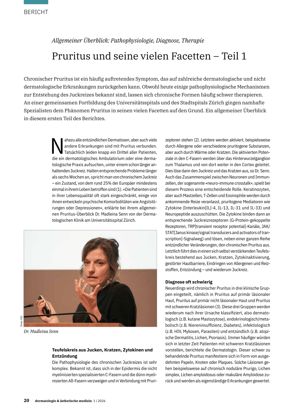 zeptoren stehen (2). Letztere werden aktiviert, beispielsweise durch Allergene oder verschiedene pruritogene Substanzen, aber auch durch Wärme oder Kratzen. Die aktivierten Potenziale in den C-Fasern werden über das Hinterwurzelganglion zum Thalamus und von dort weiter in den Cortex geleitet. Dies löse dann den Juckreiz und das Kratzen aus, so Dr. Senn. Auch das Zusammenspiel zwischen Neuronen und Immunzellen, der sogenannte «neuro-immune crosstalk», spielt bei diesem Prozess eine entscheidende Rolle. Keratinozyten, aber auch Mastzellen, T-Zellen und Eosinophile werden durch ankommende Reize veranlasst, pruritogene Mediatoren wie Zytokine (Interleukin[IL]-4, IL-13, IL-31 und IL-33) und Neuropeptide auszuschütten. Die Zytokine binden dann an entsprechende Juckreizrezeptoren (G-Protein-gekoppelte Rezeptoren, TRP[transient receptor potential]-Kanäle, JAK/ STAT[Janus kinase/signal transducers and activators of transcription]-Signalweg) und lösen, neben einer ganzen Reihe entzündlicher Veränderungen, den chronischen Pruritus aus. Letztlich führt dies in einen sich selbst verstärkenden Teufelskreis bestehend aus Jucken, Kratzen, Zytokinaktivierung, gestörter Hautbarriere, Eindringen von Allergenen und Reizstoffen, Entzündung – und wiederum Juckreiz.
