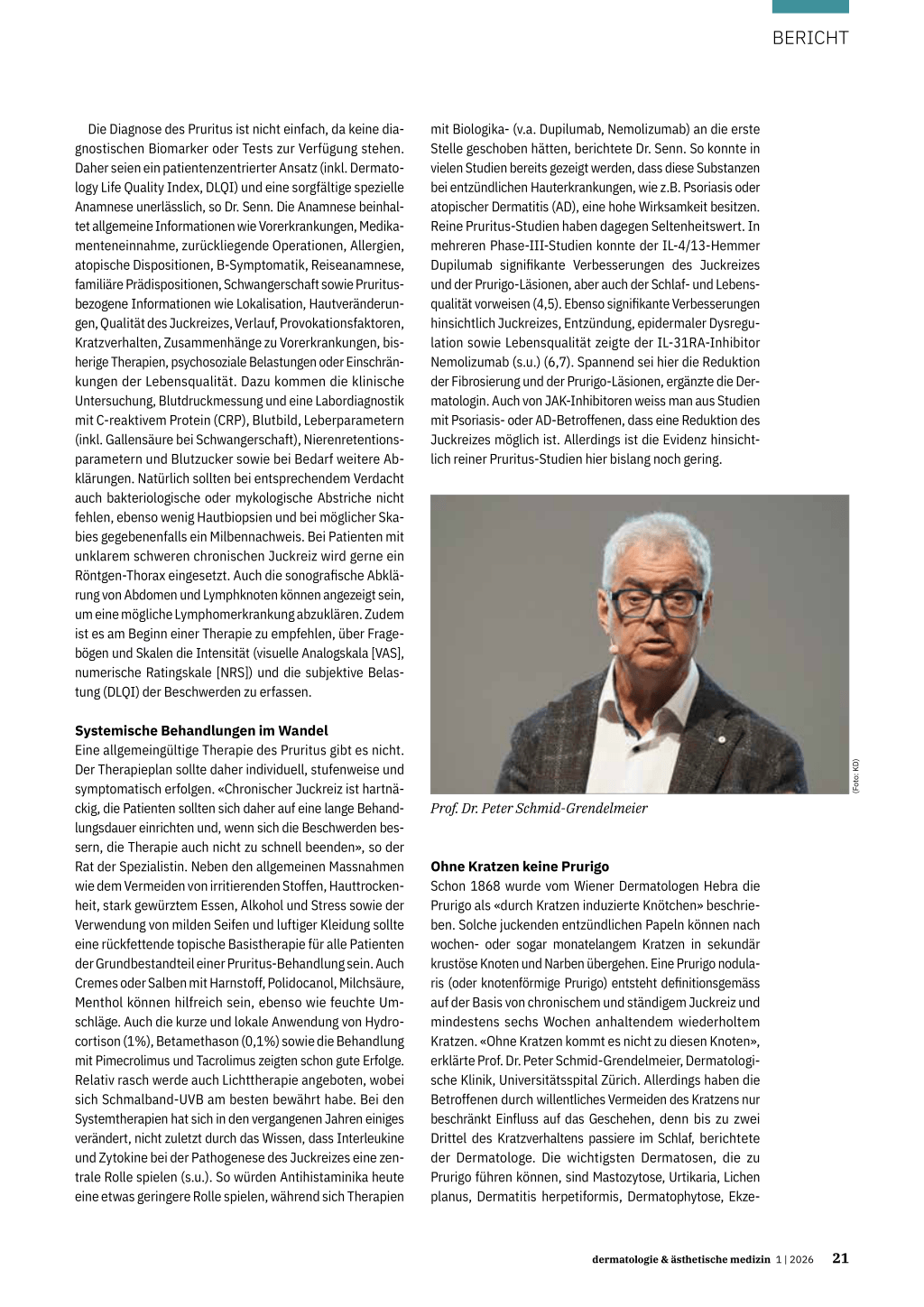 Prurigo nodularis als eigenes Krankheitsbild Bei der Entstehung und Erhaltung des Pruritus wirken unzählige Mediatoren mit. Während die Fibroblasten für den Pruritus eine eher untergeordnete Bedeutung haben, sind sie für die Entwicklung der Prurigo entscheidend. Diese spezialisierten Zellen des Bindegewebes spielen bei der Umwandlung der Haut hin zu bindegewebigen Knoten eine zentrale Rolle und sind letztlich auch ein Grund dafür, dass die Prurigo-Behandlung so schwierig ist. «Was haben wir nicht alles versucht: Lichtbehandlung, Antihistaminika, intraläsionale Steroide, Cyclosporin und anderes. Aber ehrlich gesagt, konnten wir in vielen Fällen nicht viel erreichen», erinnerte sich Prof. Schmid-Grendelmeier. Aufgrund intensiver Forschung sind die Therapieaussichten heute positiver. So weiss man, dass Interleukin 31 (IL-31) auf Fibroblasten wirkt, wie überhaupt IL-31 eine zentrale Rolle bei der Entstehung von Prurigo nodularis spielt (8). Entsprechend lässt sich durch die Hemmung von IL-31 auf die Fibrinbildung einwirken. Insgesamt wird die Prurigo nodularis, neben anderen Mechansimen, durch Typ-2-Inflammation begünstigt (9). Dieser Entzündungstyp wirkt auch bei anderen Erkrankungen wie bei der atopischen Dermatitis, beim Asthma bronchiale oder der eosinophilen Ösophagitis. Auch die Interleukine 4 und 13 (IL-4, IL-13) sind bei der Pathogenese der Prurigo sehr wichtige Faktoren. Tatsächlich zeigt die Hemmung dieser Zytokine gute Erfolge. Zwar kommt es bei der atopischen Dermatitis oft zur Prurigo nodularis, aber nicht jede Prurigo nodularis ist eine atopische Dermatitis, betonte der Zürcher Dermatologe. «Deshalb sollten andere mögliche Ursachen des Pruritus wie Hepatopathien, Nephropathien, Diabetes und anderes nicht vernachlässigt werden.» Entsprechend gelte die Prurigo nodularis nicht als Sonderform der atopischen Dermatitis, sondern sei ein eigenes Krankheitsbild.