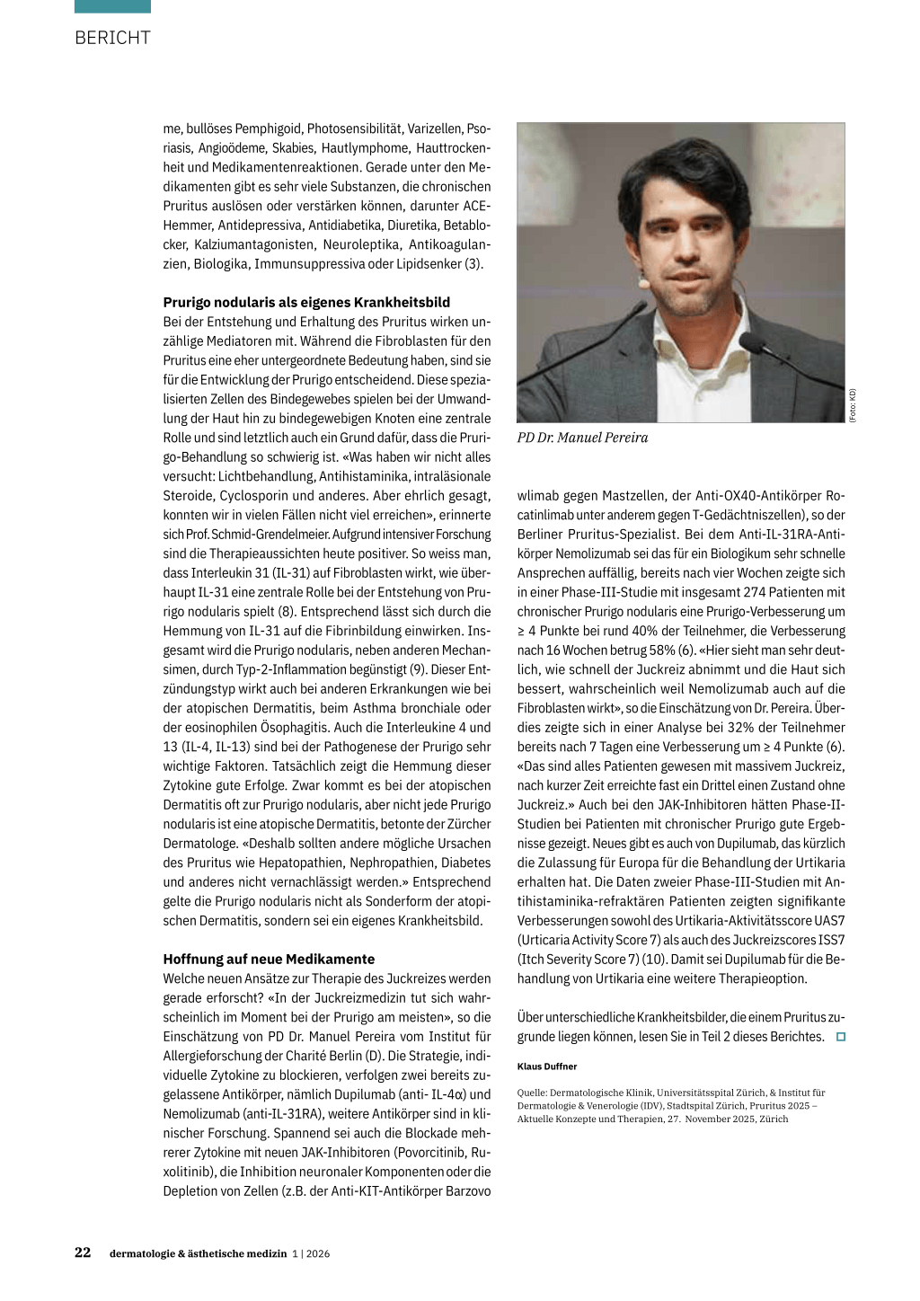 Hoffnung auf neue Medikamente Welche neuen Ansätze zur Therapie des Juckreizes werden gerade erforscht? «In der Juckreizmedizin tut sich wahrscheinlich im Moment bei der Prurigo am meisten», so die Einschätzung von PD Dr. Manuel Pereira vom Institut für Allergieforschung der Charité Berlin (D). Die Strategie, individuelle Zytokine zu blockieren, verfolgen zwei bereits zugelassene Antikörper, nämlich Dupilumab (anti- IL-4α) und Nemolizumab (anti-IL-31RA), weitere Antikörper sind in klinischer Forschung. Spannend sei auch die Blockade mehrerer Zytokine mit neuen JAK-Inhibitoren (Povorcitinib, Ruxolitinib), die Inhibition neuronaler Komponenten oder die Depletion von Zellen (z.B. der Anti-KIT-Antikörper Barzovo