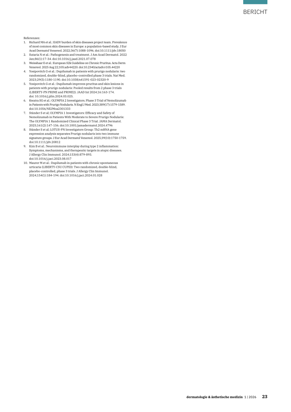 of most common skin diseases in Europe: a population-based study. J Eur Acad Dermatol Venereol. 2022;36(7):1088-1096. doi:10.1111/jdv.18050 2. Sutaria N et al.: Pathogenesis and treatment. J Am Acad Dermatol. 2022 Jan;86(1):17-34. doi:10.1016/j.jaad.2021.07.078 3. Weisshaar E et al.: European S2k Guideline on Chronic Pruritus. Acta Derm Venereol. 2025 Aug 22;105:adv44220. doi:10.2340/actadv.v105.44220 4. Yosipovitch G et al.: Dupilumab in patients with prurigo nodularis: two randomized, double-blind, placebo-controlled phase 3 trials. Nat Med. 2023;29(5):1180-1190. doi:10.1038/s41591-023-02320-9 5. Yosipovitch G et al.: Dupilumab improves pruritus and skin lesions in patients with prurigo nodularis: Pooled results from 2 phase 3 trials (LIBERTY-PN PRIME and PRIME2). JAAD Int 2024;16:163-174. doi: 10.1016/j.jdin.2024.03.025. 6. Kwatra SG et al.: OLYMPIA 2 Investigators. Phase 3 Trial of Nemolizumab in Patients with Prurigo Nodularis. N Engl J Med. 2023;389(17):1579-1589. doi:10.1056/NEJMoa2301333 7. Ständer S et al; OLYMPIA 1 Investigators: Efficacy and Safety of Nemolizumab in Patients With Moderate to Severe Prurigo Nodularis: The OLYMPIA 1 Randomized Clinical Phase 3 Trial. JAMA Dermatol. 2025;161(2):147-156. doi:10.1001/jamadermatol.2024.4796 8. Ständer S et al; LOTUS-PN Investigators Group: Th2 mRNA gene expression analysis separates Prurigo nodularis into two immune signature groups. J Eur Acad Dermatol Venereol. 2025;39(10):1750-1759. doi:10.1111/jdv.20812 9. Kim B et al.: Neuroimmune interplay during type 2 inflammation: Symptoms, mechanisms, and therapeutic targets in atopic diseases. J Allergy Clin Immunol. 2024;153(4):879-893. doi:10.1016/j.jaci.2023.08.017 10. Maurer M et al.: Dupilumab in patients with chronic spontaneous urticaria (LIBERTY-CSU CUPID): Two randomized, double-blind, placebo-controlled, phase 3 trials. J Allergy Clin Immunol. 2024;154(1):184-194. doi:10.1016/j.jaci.2024.01.028