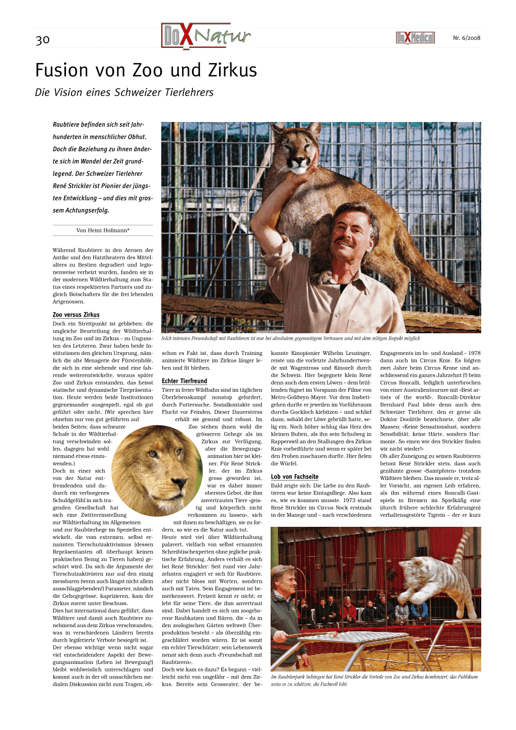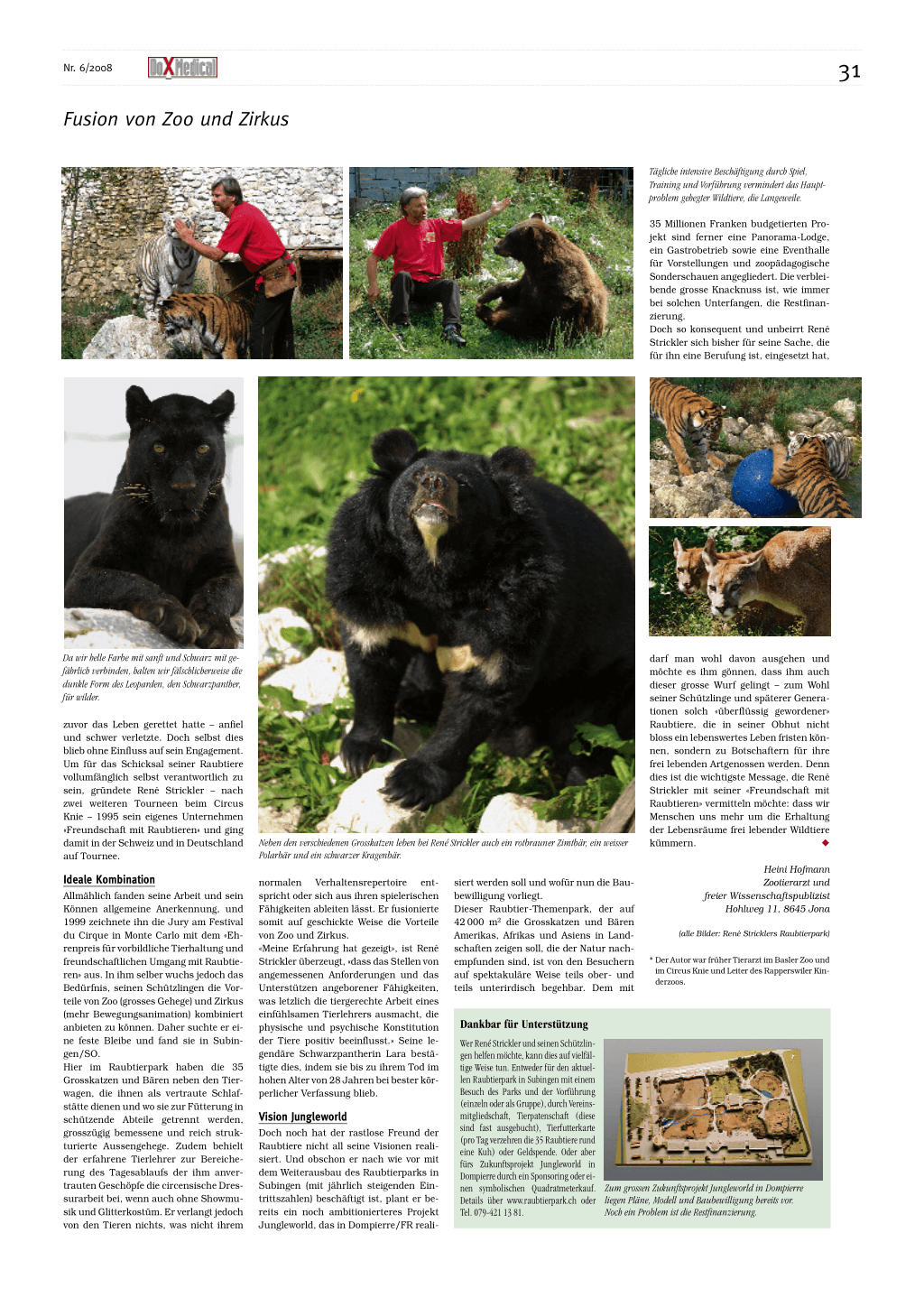 mit ihnen zu beschäftigen, sie zu fordern, so wie es die Natur auch tut. Heute wird viel über Wildtierhaltung palavert, vielfach von selbst ernannten Schreibtischexperten ohne jegliche praktische Erfahrung. Anders verhält es sich bei René Strickler: Seit rund vier Jahrzehnten engagiert er sich für Raubtiere, aber nicht bloss mit Worten, sondern auch mit Taten. Sein Engagement ist bemerkenswert. Freizeit kennt er nicht; er lebt für seine Tiere, die ihm anvertraut sind. Dabei handelt es sich um zoogeborene Raubkatzen und Bären, die – da in den zoologischen Gärten weltweit Überproduktion besteht – als überzählig eingeschläfert worden wären. Er ist somit ein echter Tierschützer; sein Lebenswerk nennt sich denn auch «Freundschaft mit Raubtieren». Doch wie kam es dazu? Es begann – vielleicht nicht von ungefähr – mit dem Zirkus. Bereits sein Grossvater, der be-