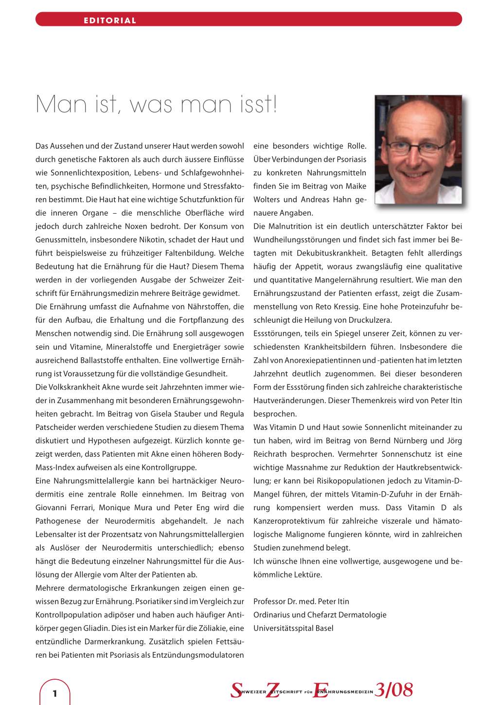eine besonders wichtige Rolle. Über Verbindungen der Psoriasis zu konkreten Nahrungsmitteln finden Sie im Beitrag von Maike Wolters und Andreas Hahn genauere Angaben. Die Malnutrition ist ein deutlich unterschätzter Faktor bei Wundheilungsstörungen und findet sich fast immer bei Betagten mit Dekubituskrankheit. Betagten fehlt allerdings häufig der Appetit, woraus zwangsläufig eine qualitative und quantitative Mangelernährung resultiert. Wie man den Ernährungszustand der Patienten erfasst, zeigt die Zusammenstellung von Reto Kressig. Eine hohe Proteinzufuhr beschleunigt die Heilung von Druckulzera. Essstörungen, teils ein Spiegel unserer Zeit, können zu verschiedensten Krankheitsbildern führen. Insbesondere die Zahl von Anorexiepatientinnen und -patienten hat im letzten Jahrzehnt deutlich zugenommen. Bei dieser besonderen Form der Essstörung finden sich zahlreiche charakteristische Hautveränderungen. Dieser Themenkreis wird von Peter Itin besprochen. Was Vitamin D und Haut sowie Sonnenlicht miteinander zu tun haben, wird im Beitrag von Bernd Nürnberg und Jörg Reichrath besprochen. Vermehrter Sonnenschutz ist eine wichtige Massnahme zur Reduktion der Hautkrebsentwicklung; er kann bei Risikopopulationen jedoch zu Vitamin-DMangel führen, der mittels Vitamin-D-Zufuhr in der Ernährung kompensiert werden muss. Dass Vitamin D als Kanzeroprotektivum für zahlreiche viszerale und hämatologische Malignome fungieren könnte, wird in zahlreichen Studien zunehmend belegt. Ich wünsche Ihnen eine vollwertige, ausgewogene und bekömmliche Lektüre.