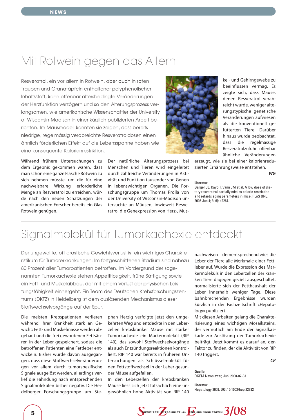 kel- und Gehirngewebe zu beeinflussen vermag. Es zeigte sich, dass Mäuse, denen Resveratrol verabreicht wurde, weniger alterungstypische genetische Veränderungen aufwiesen als die konventionell gefütterten Tiere. Darüber hinaus wurde beobachtet, dass die regelmässige Resveratrolzufuhr offenbar ähnliche Veränderungen erzeugt, wie sie bei einer kalorienreduzierten Ernährungsweise entstehen.