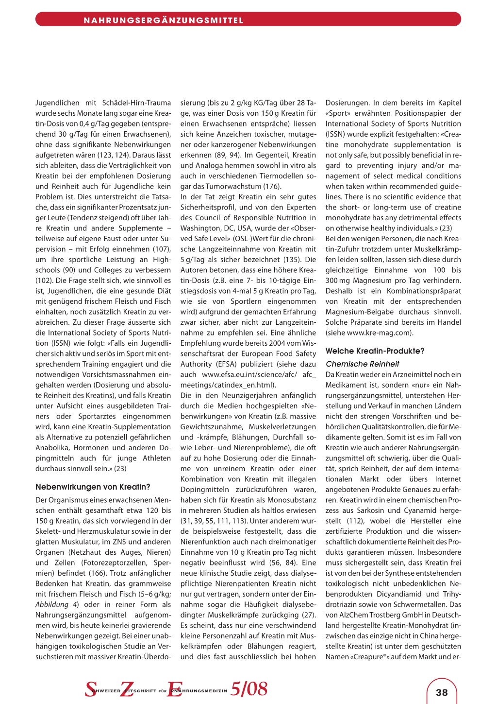 sierung (bis zu 2 g/kg KG/Tag über 28 Tage, was einer Dosis von 150 g Kreatin für einen Erwachsenen entspräche) liessen sich keine Anzeichen toxischer, mutagener oder kanzerogener Nebenwirkungen erkennen (89, 94). Im Gegenteil, Kreatin und Analoga hemmen sowohl in vitro als auch in verschiedenen Tiermodellen sogar das Tumorwachstum (176). In der Tat zeigt Kreatin ein sehr gutes Sicherheitsprofil, und von den Experten des Council of Responsible Nutrition in Washington, DC, USA, wurde der «Observed Safe Level»-(OSL-)Wert für die chronische Langzeiteinnahme von Kreatin mit 5 g/Tag als sicher bezeichnet (135). Die Autoren betonen, dass eine höhere Kreatin-Dosis (z.B. eine 7- bis 10-tägige Einstiegsdosis von 4-mal 5 g Kreatin pro Tag, wie sie von Sportlern eingenommen wird) aufgrund der gemachten Erfahrung zwar sicher, aber nicht zur Langzeiteinnahme zu empfehlen sei. Eine ähnliche Empfehlung wurde bereits 2004 vom Wissenschaftsrat der European Food Safety Authority (EFSA) publiziert (siehe dazu auch www.efsa.eu.int/science/afc/ afc_ meetings/catindex_en.html). Die in den Neunzigerjahren anfänglich durch die Medien hochgespielten «Nebenwirkungen» von Kreatin (z.B. massive Gewichtszunahme, Muskelverletzungen und -krämpfe, Blähungen, Durchfall sowie Leber- und Nierenprobleme), die oft auf zu hohe Dosierung oder die Einnahme von unreinem Kreatin oder einer Kombination von Kreatin mit illegalen Dopingmitteln zurückzuführen waren, haben sich für Kreatin als Monosubstanz in mehreren Studien als haltlos erwiesen (31, 39, 55, 111, 113). Unter anderem wurde beispielsweise festgestellt, dass die Nierenfunktion auch nach dreimonatiger Einnahme von 10 g Kreatin pro Tag nicht negativ beeinflusst wird (56, 84). Eine neue klinische Studie zeigt, dass dialysepflichtige Nierenpatienten Kreatin nicht nur gut vertragen, sondern unter der Einnahme sogar die Häufigkeit dialysebedingter Muskelkrämpfe zurückging (27). Es scheint, dass nur eine verschwindend kleine Personenzahl auf Kreatin mit Muskelkrämpfen oder Blähungen reagiert, und dies fast ausschliesslich bei hohen