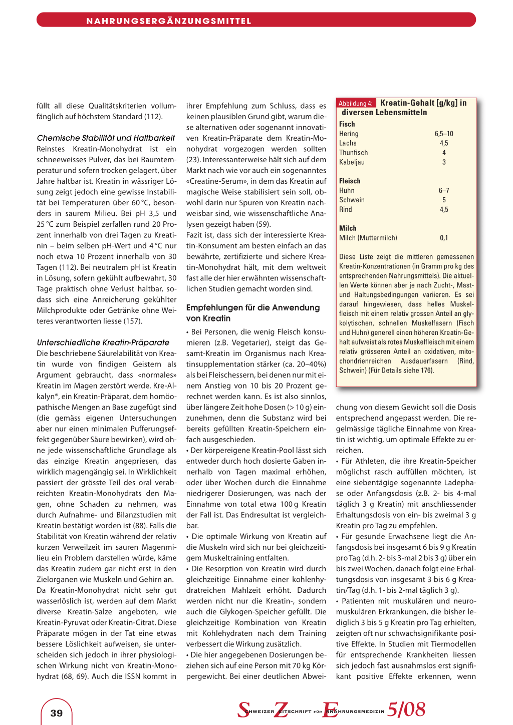 Der Organismus eines erwachsenen Menschen enthält gesamthaft etwa 120 bis 150 g Kreatin, das sich vorwiegend in der Skelett- und Herzmuskulatur sowie in der glatten Muskulatur, im ZNS und anderen Organen (Netzhaut des Auges, Nieren) und Zellen (Fotorezeptorzellen, Spermien) befindet (166). Trotz anfänglicher Bedenken hat Kreatin, das grammweise mit frischem Fleisch und Fisch (5–6 g/kg; Abbildung 4) oder in reiner Form als Nahrungsergänzungsmittel aufgenommen wird, bis heute keinerlei gravierende Nebenwirkungen gezeigt. Bei einer unabhängigen toxikologischen Studie an Versuchstieren mit massiver Kreatin-Überdo-