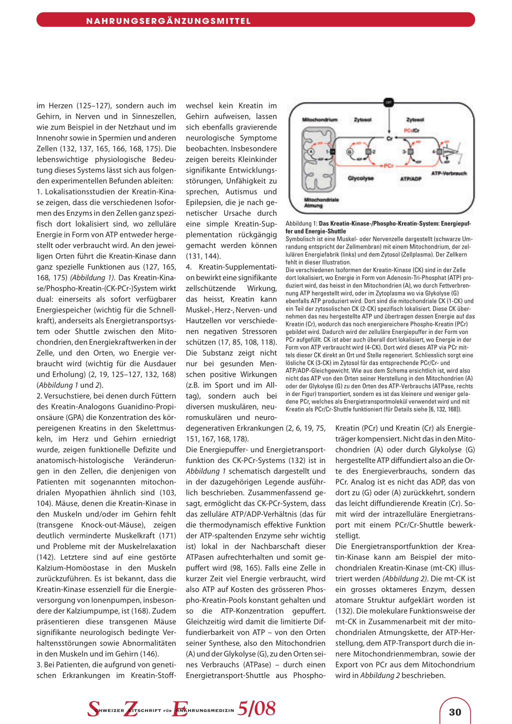 im Herzen (125–127), sondern auch im Gehirn, in Nerven und in Sinneszellen, wie zum Beispiel in der Netzhaut und im Innenohr sowie in Spermien und anderen Zellen (132, 137, 165, 166, 168, 175). Die lebenswichtige physiologische Bedeutung dieses Systems lässt sich aus folgenden experimentellen Befunden ableiten: 1. Lokalisationsstudien der Kreatin-Kinase zeigen, dass die verschiedenen Isoformen des Enzyms in den Zellen ganz spezifisch dort lokalisiert sind, wo zelluläre Energie in Form von ATP entweder hergestellt oder verbraucht wird. An den jeweiligen Orten führt die Kreatin-Kinase dann ganz spezielle Funktionen aus (127, 165, 168, 175) (Abbildung 1). Das Kreatin-Kinase/Phospho-Kreatin-(CK-PCr-)System wirkt dual: einerseits als sofort verfügbarer Energiespeicher (wichtig für die Schnellkraft), anderseits als Energietransportsystem oder Shuttle zwischen den Mitochondrien, den Energiekraftwerken in der Zelle, und den Orten, wo Energie verbraucht wird (wichtig für die Ausdauer und Erholung) (2, 19, 125–127, 132, 168) (Abbildung 1 und 2). 2. Versuchstiere, bei denen durch Füttern des Kreatin-Analogons Guanidino-Propionsäure (GPA) die Konzentration des körpereigenen Kreatins in den Skelettmuskeln, im Herz und Gehirn erniedrigt wurde, zeigen funktionelle Defizite und anatomisch-histologische Veränderungen in den Zellen, die denjenigen von Patienten mit sogenannten mitochondrialen Myopathien ähnlich sind (103, 104). Mäuse, denen die Kreatin-Kinase in den Muskeln und/oder im Gehirn fehlt (transgene Knock-out-Mäuse), zeigen deutlich verminderte Muskelkraft (171) und Probleme mit der Muskelrelaxation (142). Letztere sind auf eine gestörte Kalzium-Homöostase in den Muskeln zurückzuführen. Es ist bekannt, dass die Kreatin-Kinase essenziell für die Energieversorgung von Ionenpumpen, insbesondere der Kalziumpumpe, ist (168). Zudem präsentieren diese transgenen Mäuse signifikante neurologisch bedingte Verhaltensstörungen sowie Abnormalitäten in den Muskeln und im Gehirn (146). 3. Bei Patienten, die aufgrund von genetischen Erkrankungen im Kreatin-Stoff-