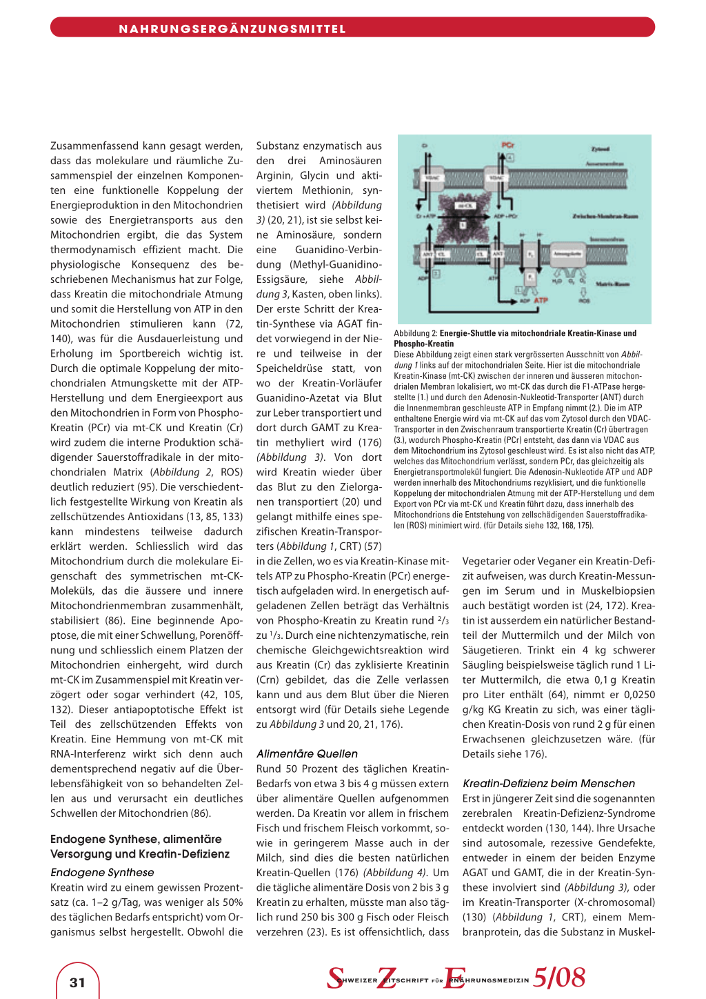Zusammenfassend kann gesagt werden, dass das molekulare und räumliche Zusammenspiel der einzelnen Komponenten eine funktionelle Koppelung der Energieproduktion in den Mitochondrien sowie des Energietransports aus den Mitochondrien ergibt, die das System thermodynamisch effizient macht. Die physiologische Konsequenz des beschriebenen Mechanismus hat zur Folge, dass Kreatin die mitochondriale Atmung und somit die Herstellung von ATP in den Mitochondrien stimulieren kann (72, 140), was für die Ausdauerleistung und Erholung im Sportbereich wichtig ist. Durch die optimale Koppelung der mitochondrialen Atmungskette mit der ATPHerstellung und dem Energieexport aus den Mitochondrien in Form von PhosphoKreatin (PCr) via mt-CK und Kreatin (Cr) wird zudem die interne Produktion schädigender Sauerstoffradikale in der mitochondrialen Matrix (Abbildung 2, ROS) deutlich reduziert (95). Die verschiedentlich festgestellte Wirkung von Kreatin als zellschützendes Antioxidans (13, 85, 133) kann mindestens teilweise dadurch erklärt werden. Schliesslich wird das Mitochondrium durch die molekulare Eigenschaft des symmetrischen mt-CKMoleküls, das die äussere und innere Mitochondrienmembran zusammenhält, stabilisiert (86). Eine beginnende Apoptose, die mit einer Schwellung, Porenöffnung und schliesslich einem Platzen der Mitochondrien einhergeht, wird durch mt-CK im Zusammenspiel mit Kreatin verzögert oder sogar verhindert (42, 105, 132). Dieser antiapoptotische Effekt ist Teil des zellschützenden Effekts von Kreatin. Eine Hemmung von mt-CK mit RNA-Interferenz wirkt sich denn auch dementsprechend negativ auf die Überlebensfähigkeit von so behandelten Zellen aus und verursacht ein deutliches Schwellen der Mitochondrien (86).