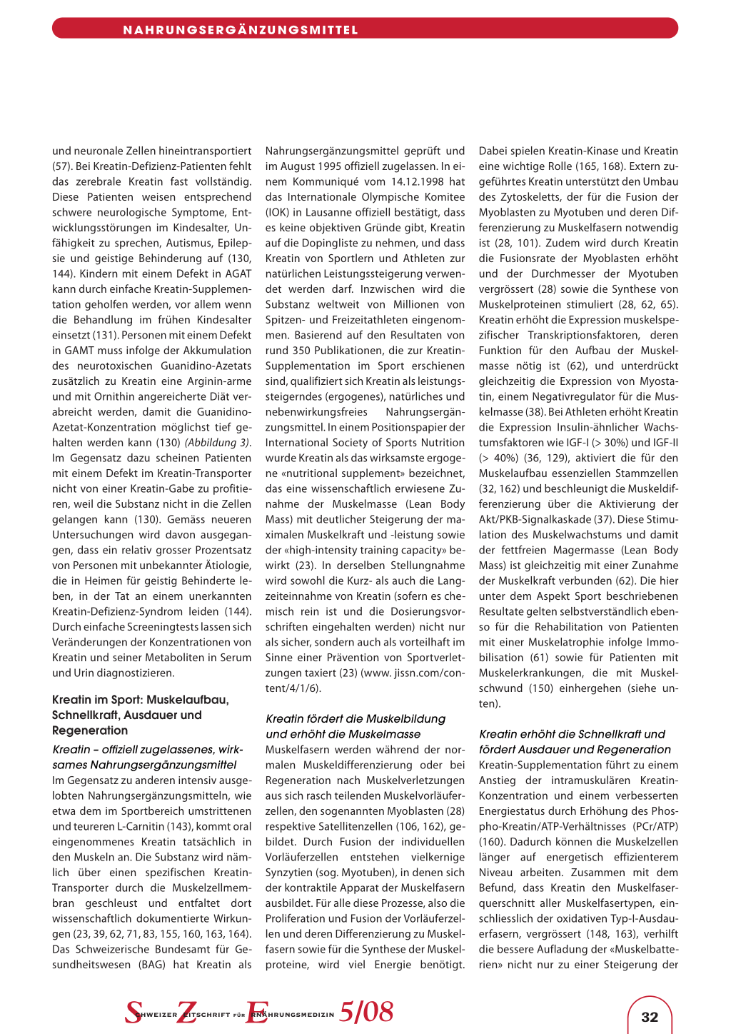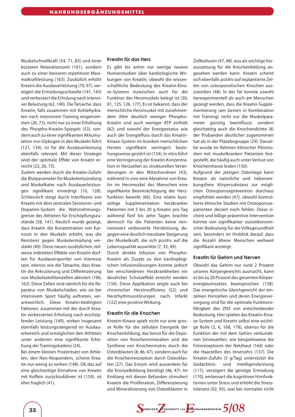 Muskelschnellkraft (54, 71, 83) und einer kürzeren Relaxationszeit (161), sondern auch zu einer besseren repetitiven Maximalkraftleistung (163). Zusätzlich erhöht Kreatin die Ausdauerleistung (70, 97), verzögert die Ermüdungsschwelle (141, 145) und verbessert die Erholung nach intensiver Belastung (62, 140). Die Tatsache, dass Kreatin, falls zusammen mit Kohlehydraten nach intensivem Training eingenommen (26, 73), nicht nur zu einer Erhöhung des Phospho-Kreatin-Spiegels (53), sondern auch zu einer signifikanten Akkumulation von Glykogen in den Muskeln führt (121, 134), ist für die Ausdauerleistung ebenfalls relevant. Mit dieser Strategie wird der optimale Effekt von Kreatin erreicht (23, 26, 73). Zudem werden durch die Kreatin-Zufuhr die Blutparameter für Muskelentzündung und Muskelkater nach Ausdauerleistungen signifikant erniedrigt (10, 128). Schliesslich steigt durch Interferenz von Kreatin mit dem zentralen Serotonin- und Dopamin-System die Wahrnehmungsgrenze des Athleten für Erschöpfungszustände (58, 141). Neulich wurde gezeigt, dass Kreatin die Konzentration von Karnosin in den Muskeln erhöht, was die Resistenz gegen Muskelermüdung verstärkt (40). Diese neuen zusätzlichen, teilweise indirekten Effekte von Kreatin dürften für Ausdauersportler von Interesse sein, ebenso wie die Tatsache, dass Kreatin die Rekrutierung und Differenzierung von Muskelsatellitenzellen aktiviert (106, 162). Diese Zellen sind nämlich für die Reparatur von Muskelschäden, wie sie bei intensivem Sport häufig auftreten, verantwortlich. Diese Kreatin-bedingten Faktoren, zusammen mit der durch Kreatin verbesserten Erholung nach erschöpfender Leistung (140), wirken insgesamt ebenfalls leistungssteigernd im Ausdauerbereich und ermöglichen den Athleten unter anderem eine signifikante Erhöhung der Trainingskadenz (24). Bei einem kleinen Prozentsatz von Athleten, den Non-Respondern, scheint Kreatin nur wenig zu wirken (148). Ob das auf eine gleichzeitige Einnahme von Kreatin mit Koffein zurückzuführen ist (159), ist eher fraglich (41).